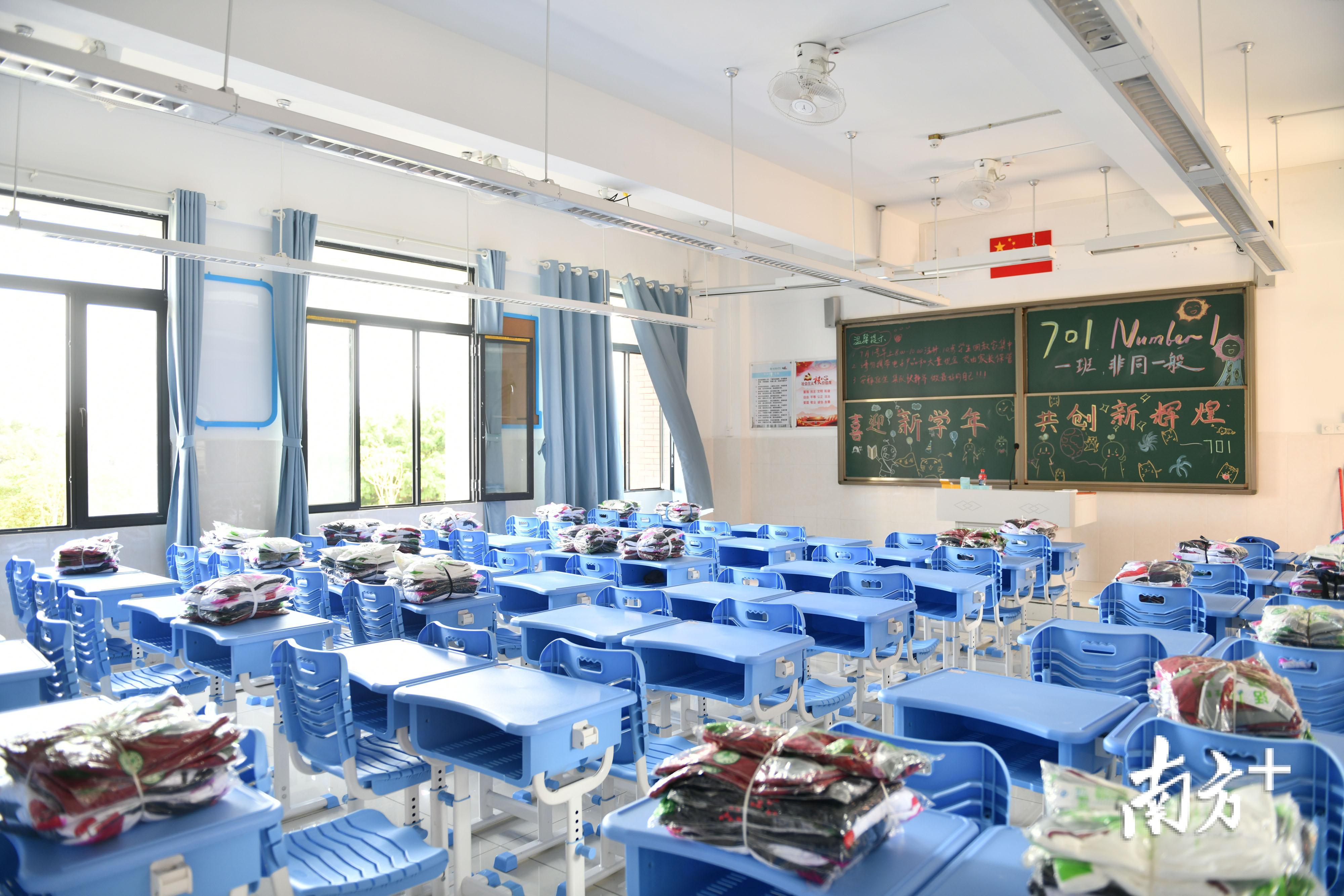 教学楼内,收拾整齐的教室则说明一切都已就绪——教室门口旁悬挂的电子屏显示着班级的基本情况,靠走廊侧的窗户下,花架摆满了学生带回来的盆栽。走进课室,“欢迎新同学”主题的黑板报跃入眼帘,崭新的课桌上码放着同学们的新校服。