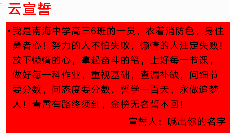 “青霄有路终须到,金榜无名誓不回!”南海中学高三6班班主任带领学生们开展了一场特别的百日誓师班会。在“云升旗”之后,邓栋、曾思程、何玮婷、冯洁勤等几位同学分享备考学习心得,来自学校、老师、家长、学姐、宿舍的寄语分享在屏幕上。最后,该班举行百日倒计时牌转交仪式和“云宣誓”,铮铮誓词涤荡在每个人心田。