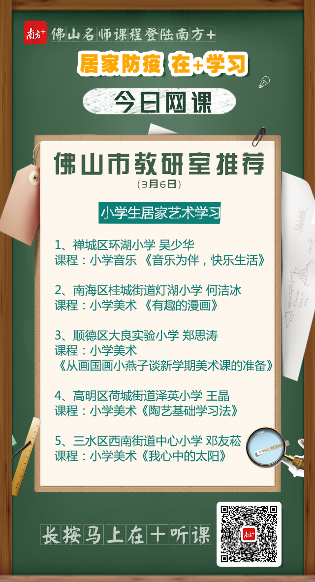 今天,“佛山大课堂”以艺术课程学习为专题,邀请到佛山市教育局教研室综合部主任、美术教研员陈日新和音乐教研员曾春燕共同为我们推荐了分别来自禅城区环湖小学、南海区桂城街道灯湖小学、顺德区大良实验小学、高明区荷城街道泽英小学和三水区西南街道中心小学的5位名师执教的精品课,隆重推出佛山市中小学名师课程表(第三期)。