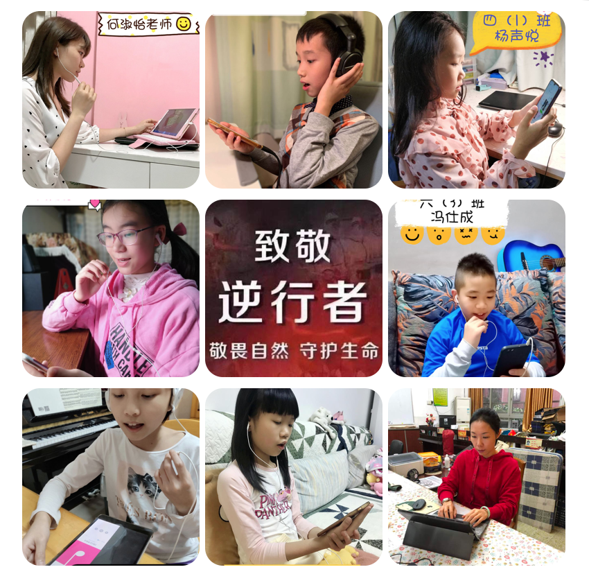 因为疫情原因,师生们无法回学校进行合唱录制怎么办?黄倩文和何淑怡想了个好办法,先由何老师用手机录制一个母带发给同学们,同学们学会后,在家用手机录制,再汇总,进行声音合成。