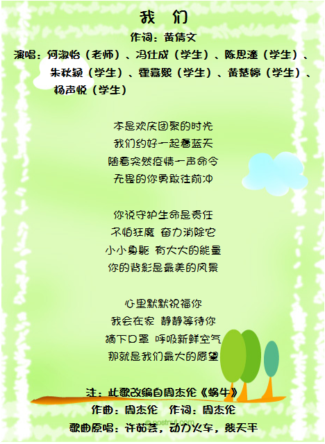 “在这场没有销烟的战争中,我们的家人、朋友,为了我们的生命安全,舍小家,为大家,积极投身到抗疫一线中。据统计,我们学校就有253位家长在不同岗位、不同地方参与到这次抗疫战中。为了致敬一线工作者,为他们送上温暖和祝福,作为大队部老师,我就想到通过这样歌曲改编的创作方式,和学生们一起表达内心的敬意。”黄倩文说。