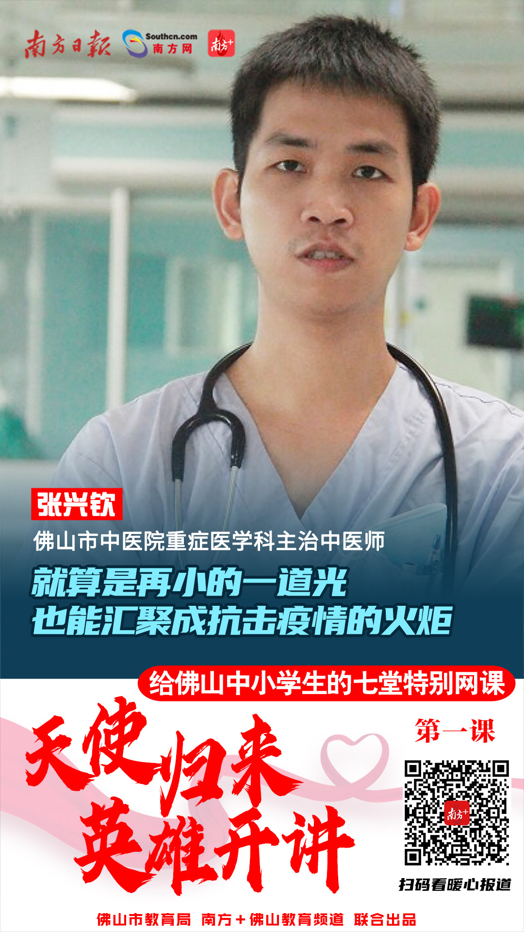 面对突如其来的新冠肺炎疫情,援鄂医疗队员们白衣执甲、逆行出征。在疫情防控的关键时刻,佛山有352名医务工作者义无反顾、毫无畏惧地投身到武汉、荆州的一线救治工作中。他们不怕牺牲,冲锋在前;他们与时间赛跑,与病毒较量;他们用实际行动诠释医者仁心、人间大爱,彰显了临危不惧、勇往直前、舍己救人的责任与担当。心怀家国,为国“逆行”,白衣天使一线抗疫的故事,本身也是一堂生动的人生教育课。为让更多中小学生学习了解佛山“英雄”湖北抗疫的故事,佛山市教育局、南方+佛山教育频道从今日起特别策划推出“天使归来 英雄开讲——给佛山中小学生的七堂特别网课”,邀请七位佛山“英雄”,线上开讲战“疫”公开课,敬请关注。
