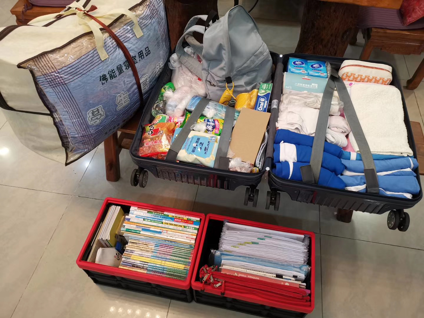 顺德区某家长为孩子准备的行李,整整齐齐,满满当当!