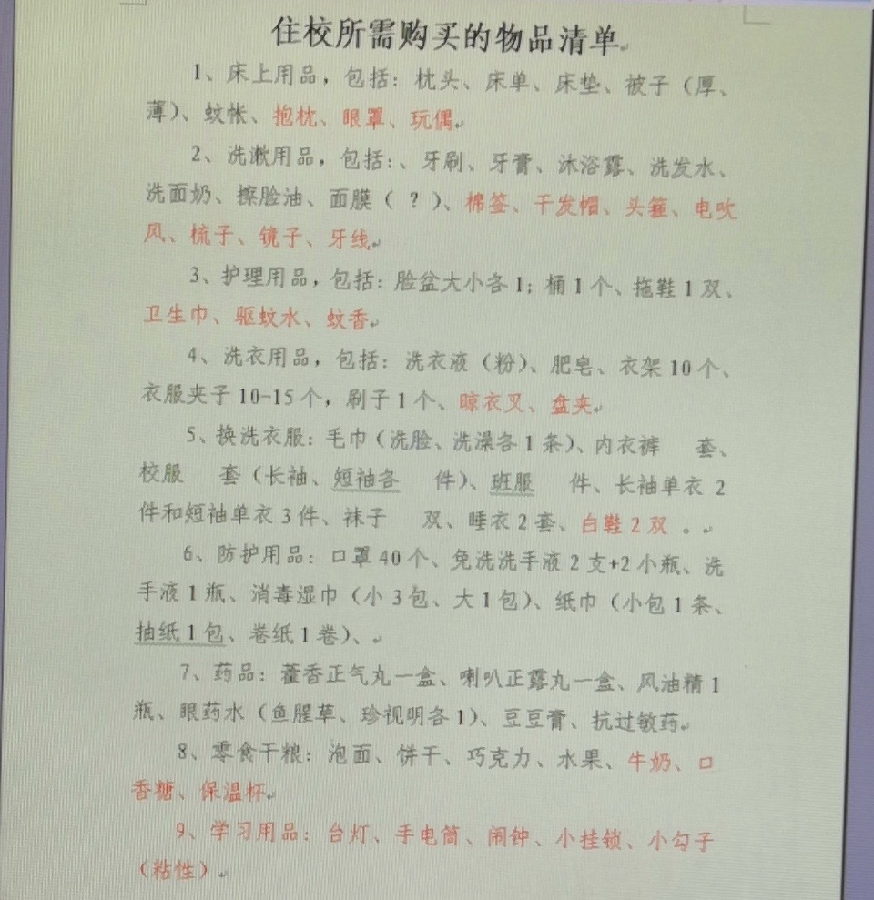 佛山市华英学校某初三家长同样给女儿列了9条住校所需购买的物品清单,含床上用品、洗漱用品、护理用品、洗衣用品、防护用品、药品、零食干粮等,还特意用红字为孩子准备了额外的小物件,如抱枕、眼罩、驱蚊水、保温杯、手电筒等,非常贴心!