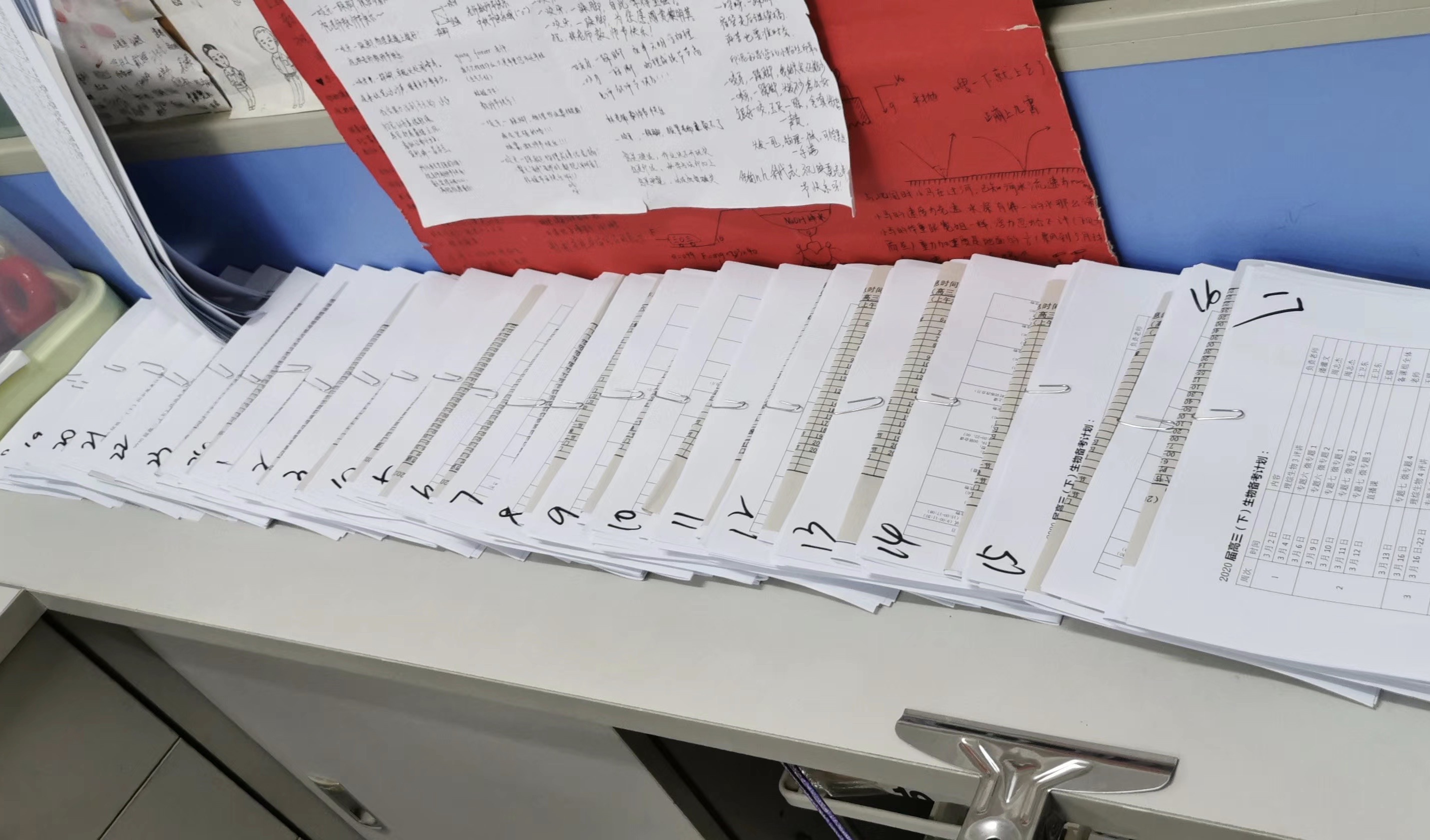 佛山一中高三级长林映霓精心准备了24个班级的准备资料,用于张贴在教室里,包括(1)各科到高考的备考安排(2)自习课,晚修等老师的值班位置安排(3)行事历(每天的教学安排)(4)作息时间表。