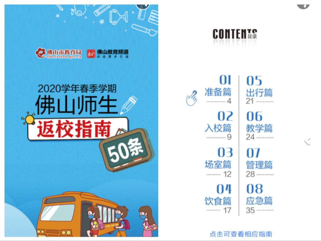 返校前还有哪些要注意?佛山市教育局和南方+佛山教育频道联合出品2020学年春季学期《师生返校指南50条》手册,共分为准备篇、入校篇、场室篇、出行篇、教学篇、管理篇和应急篇八大篇章。针对社会上普遍关注的返校50条问题,图文并茂地予以全面解答。别忘了阅读哦!(点击此处阅读手册电子版)