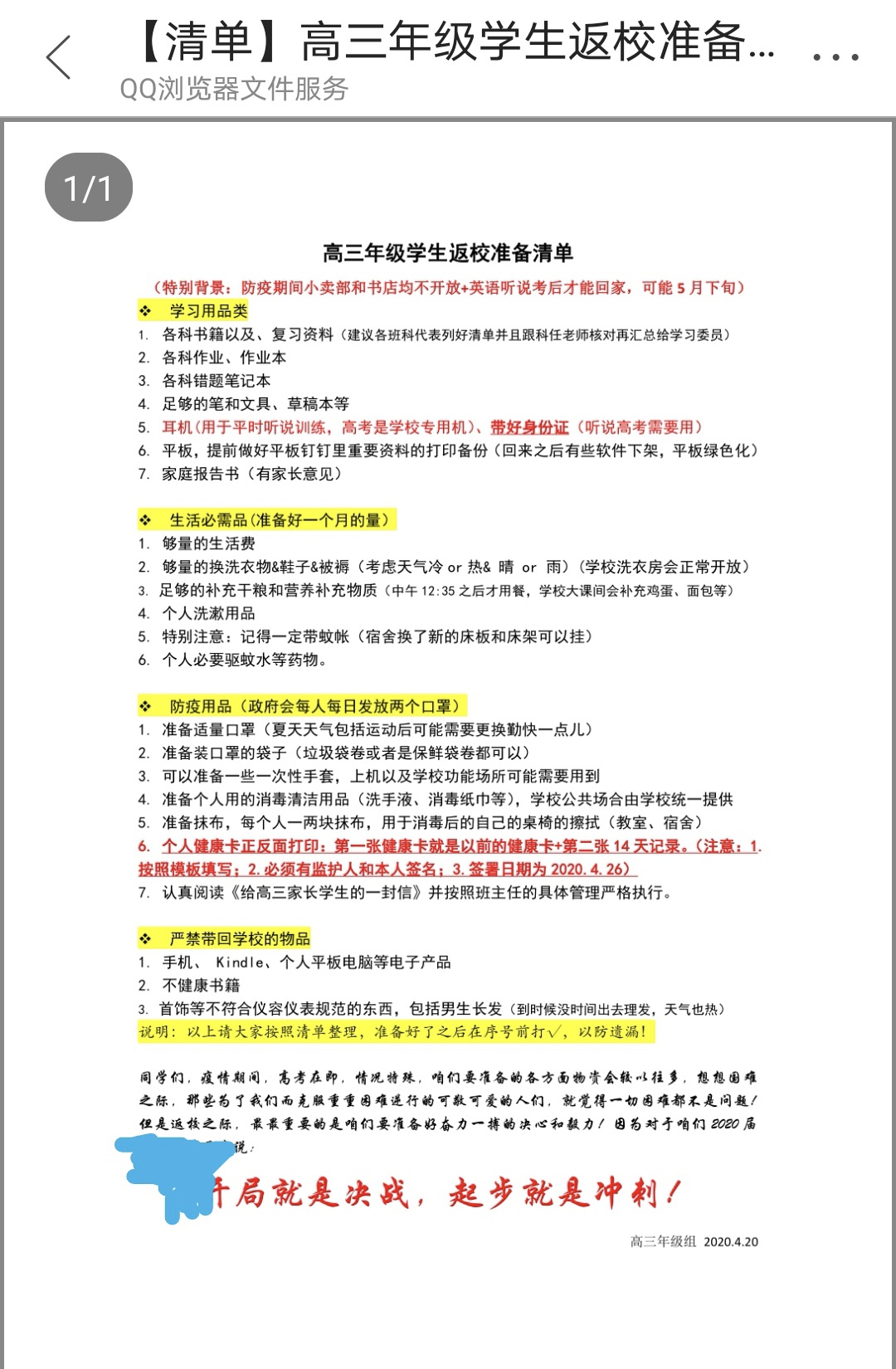 “开局就是决战,起步就是冲刺!”佛山某高中为学生们列好详细的返校准备清单,包括学习用品类、生活必需品、防疫用品、严禁带回学校的用品等。同学们要注意不要带漏咯!