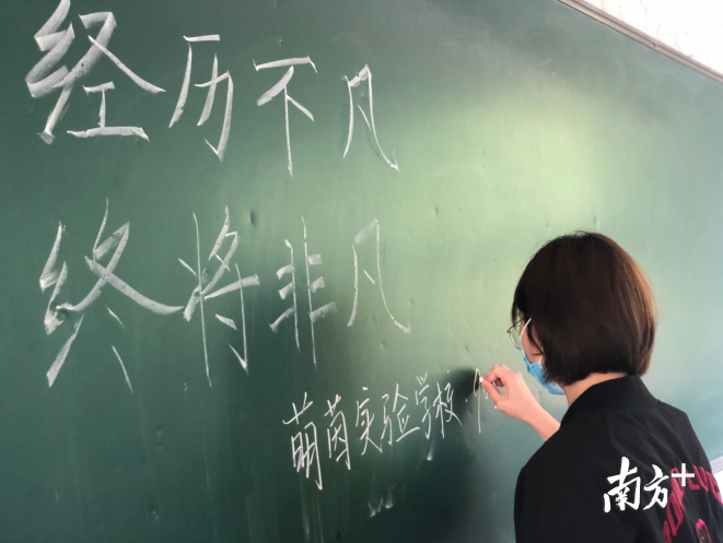 #三水#“经历不凡,终将非凡”佛山萌茵实验学校设置了展板欢迎首批学生返校,教师用粉笔在黑板上写上鼓励语句激励学生发奋学习。