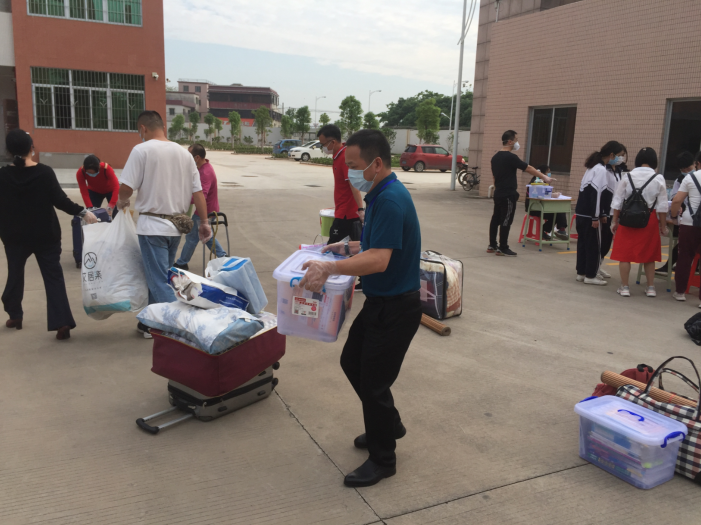 #三水#三水区西南街道第四中学落实上级有关规定,做好有温度的疫情防控工作,既做好准备,严阵以待;又关心周到,无微不至,由学校领导、班主任和科任老师为学生搬运行李,600余名学生分批有序进校。