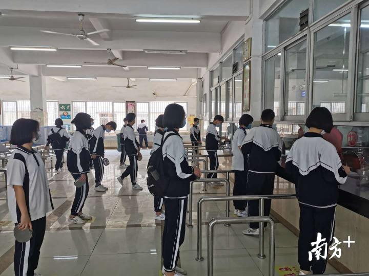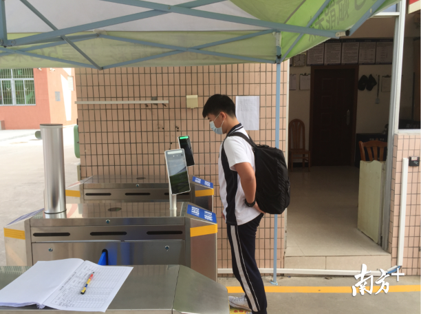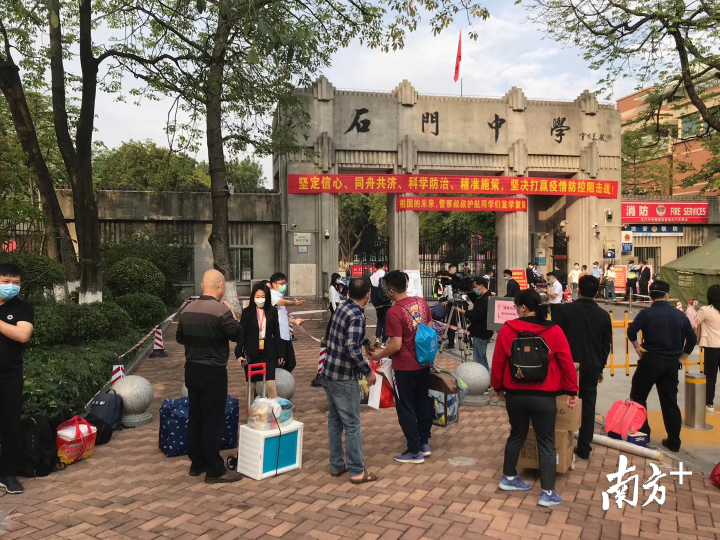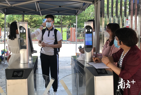 #南海#从早上7时开始,石门中学的学生已陆续开始返校,学生排开一米间隔有序进行人脸识别测温,家长一律不得入内,教师志愿者协助返校学生搬行李。