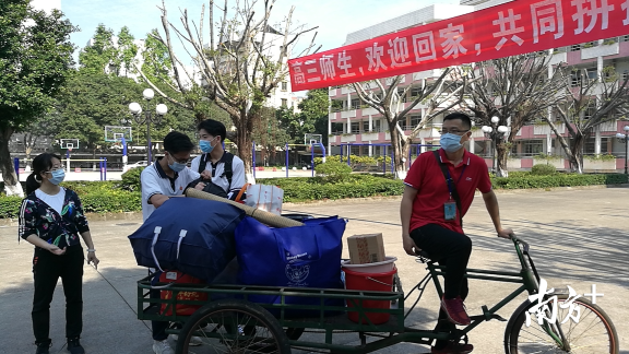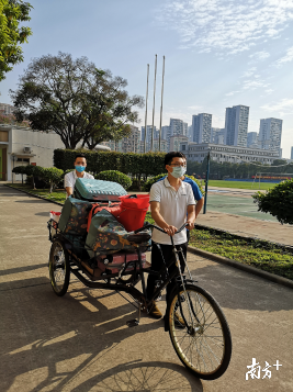 #禅城#佛山市实验学校的学生们今天返校,体育老师们用三轮车帮学子们运送行李。