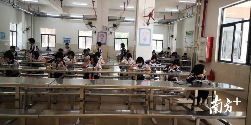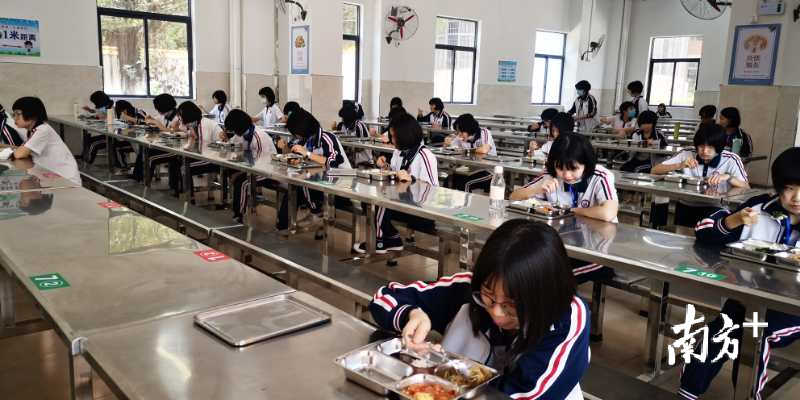 #高明#高明区荷城中学初三的学生就餐时严格间隔一段距离,并全部同向而坐,不能面对面就坐。