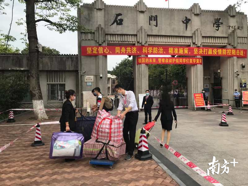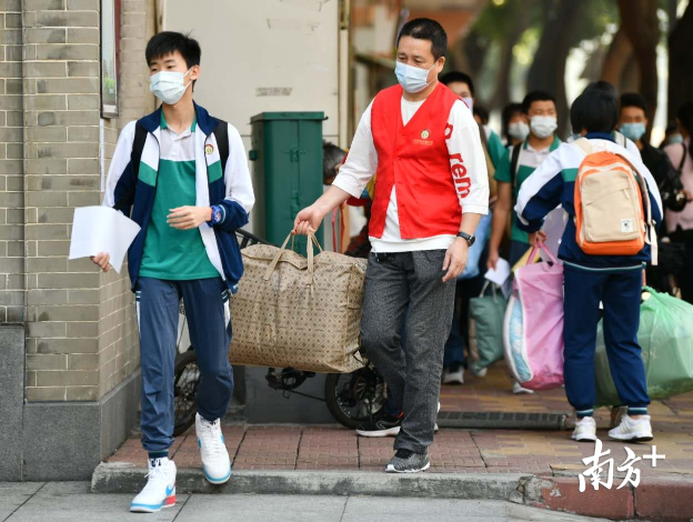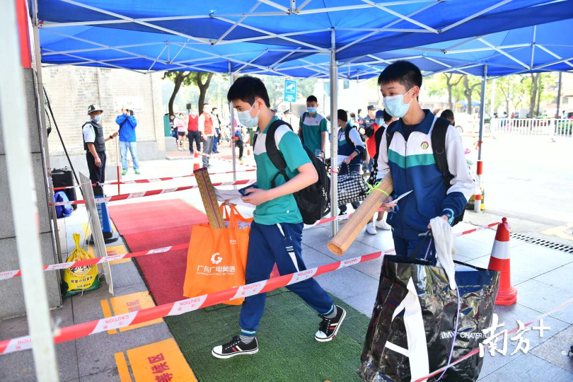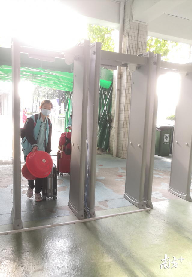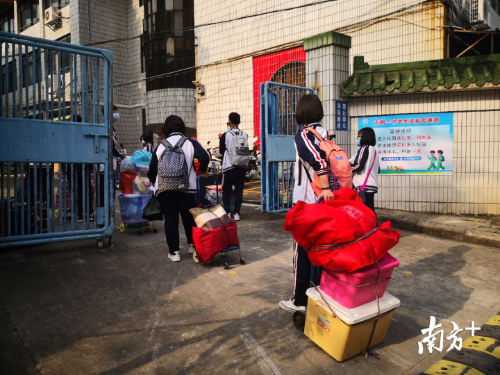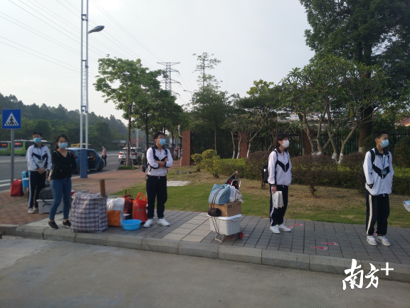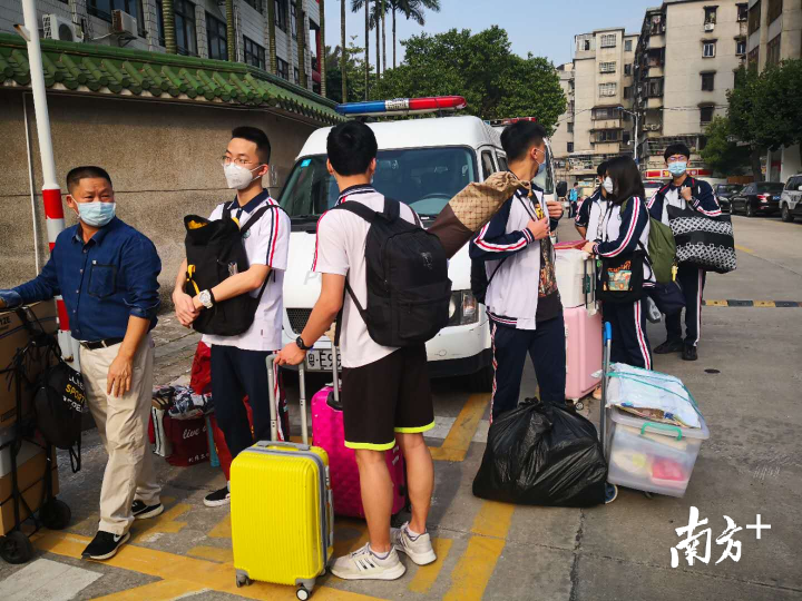 按照相关规定,学子们分批返校。今天早上8时至8时30分,是佛山市高三2班51名学生返校的规定时间。8时20分左右,该班的学生已基本返校。该班班主任李老师一早就在校门口守候,帮学子们搬行李,叮嘱他们戴好口罩,指引他们把行李先搬到指定区域。