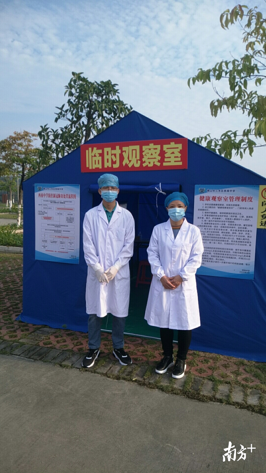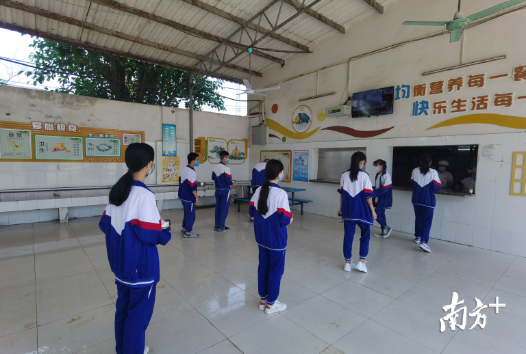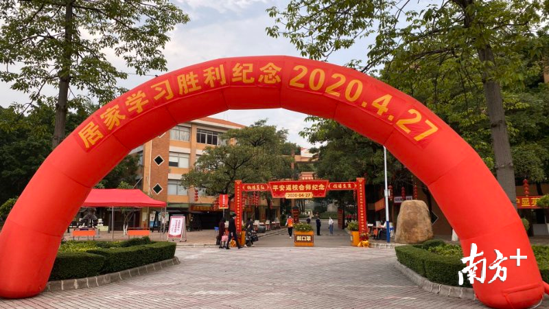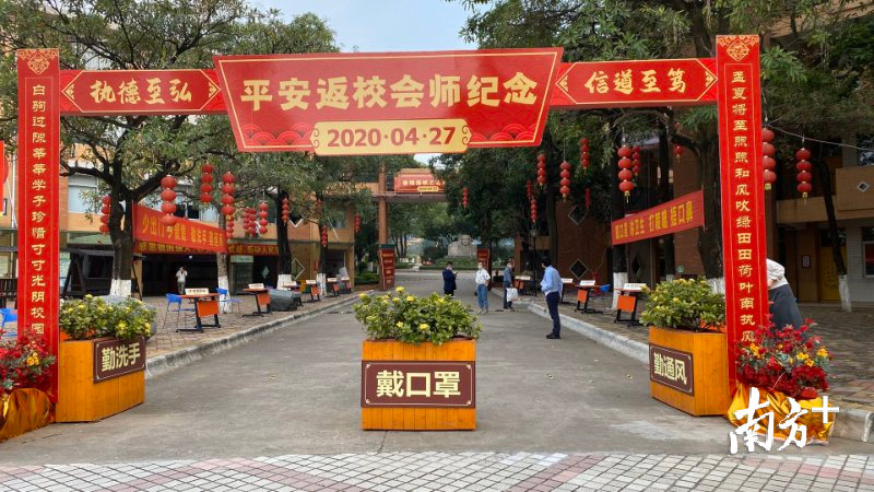 4月27日,三水乐平中学初三级学子上下午分四批近千人错峰返校,校领导在正门口指挥学生站队,手持测温、人脸识别测温同时进行,加快通过,以免造成扎堆。校长、教师等也亲自到正门口帮学生搬运行李。进校后,老师们对学生双手及行李进行消毒。学生到宿舍整理行李后,到课室参加复学第一课。学生、教职工错峰用餐,进入饭堂前,进行人脸识别测温,排队取餐也保持安全距离,按班级就座。