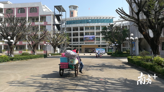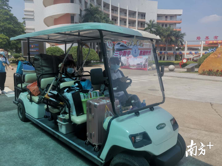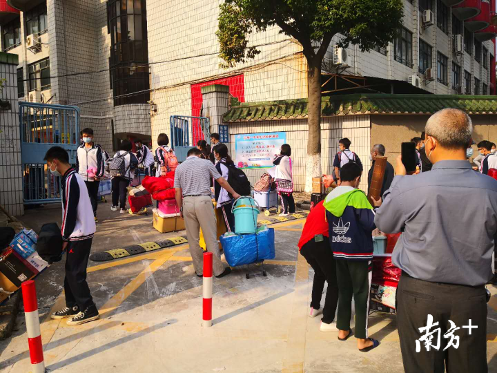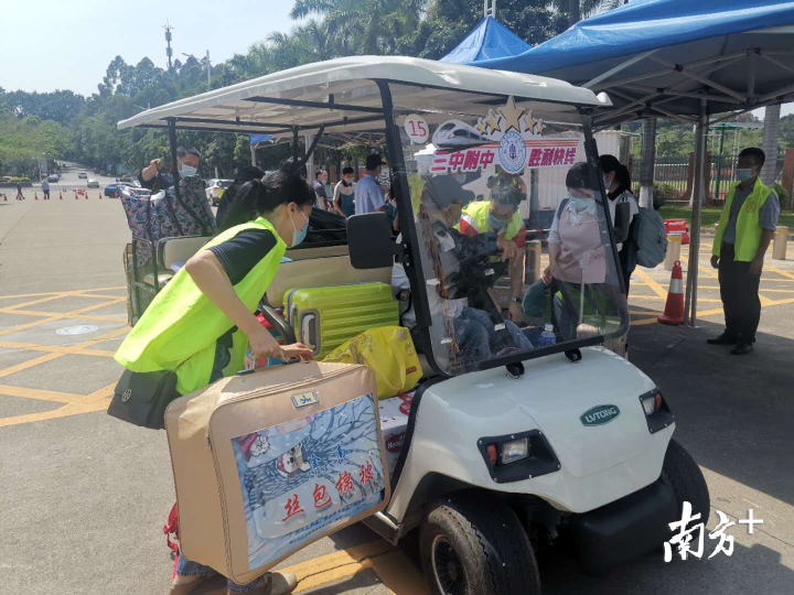 #南海#南海中学,学校通过摆渡车将学生行李运到校内固定地点。学生来取走拿回宿舍。