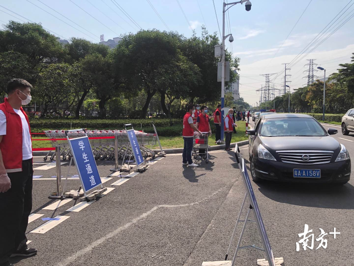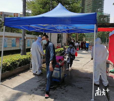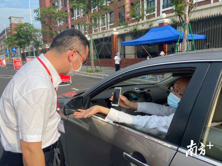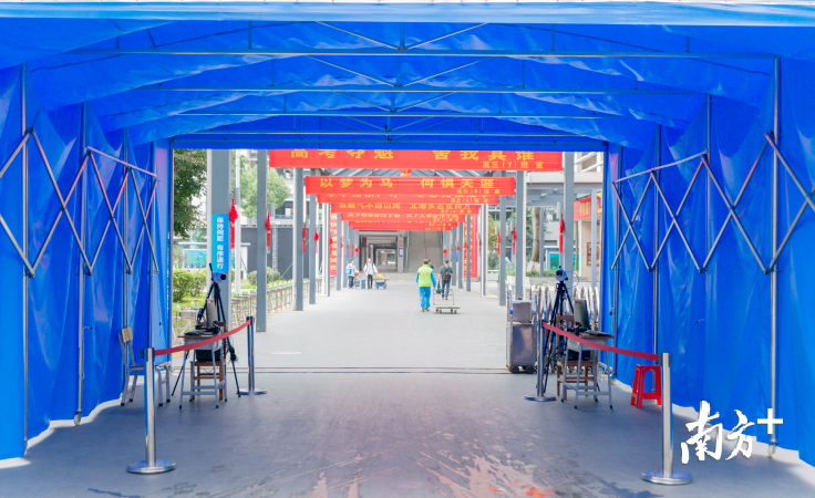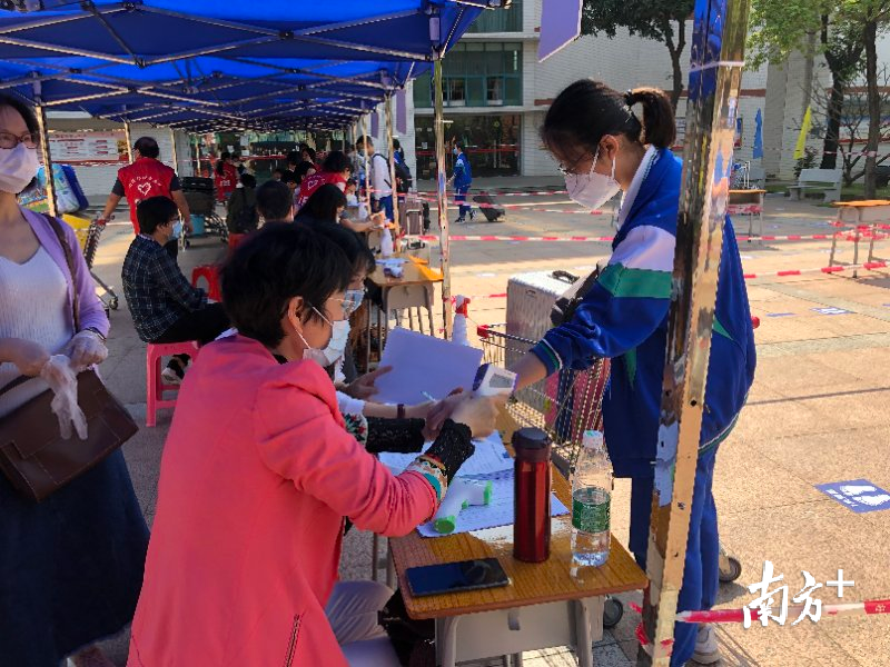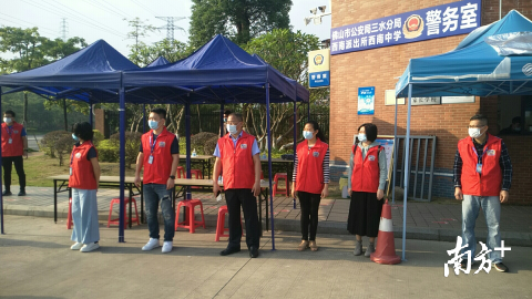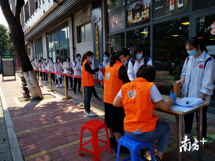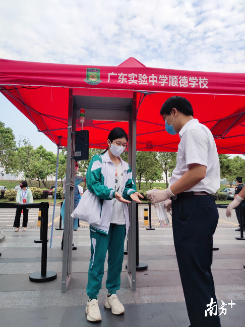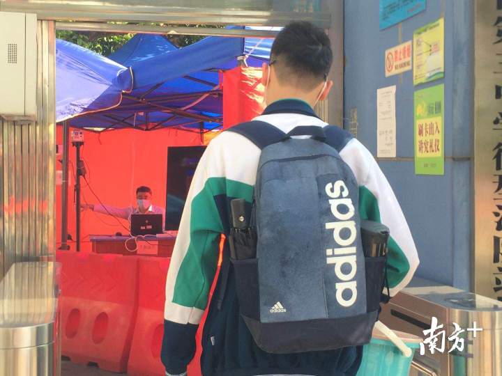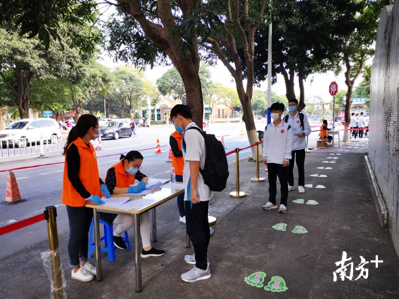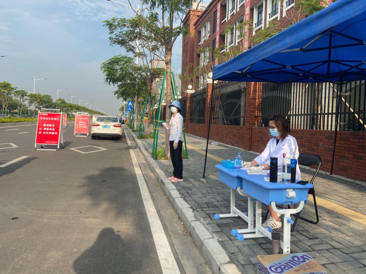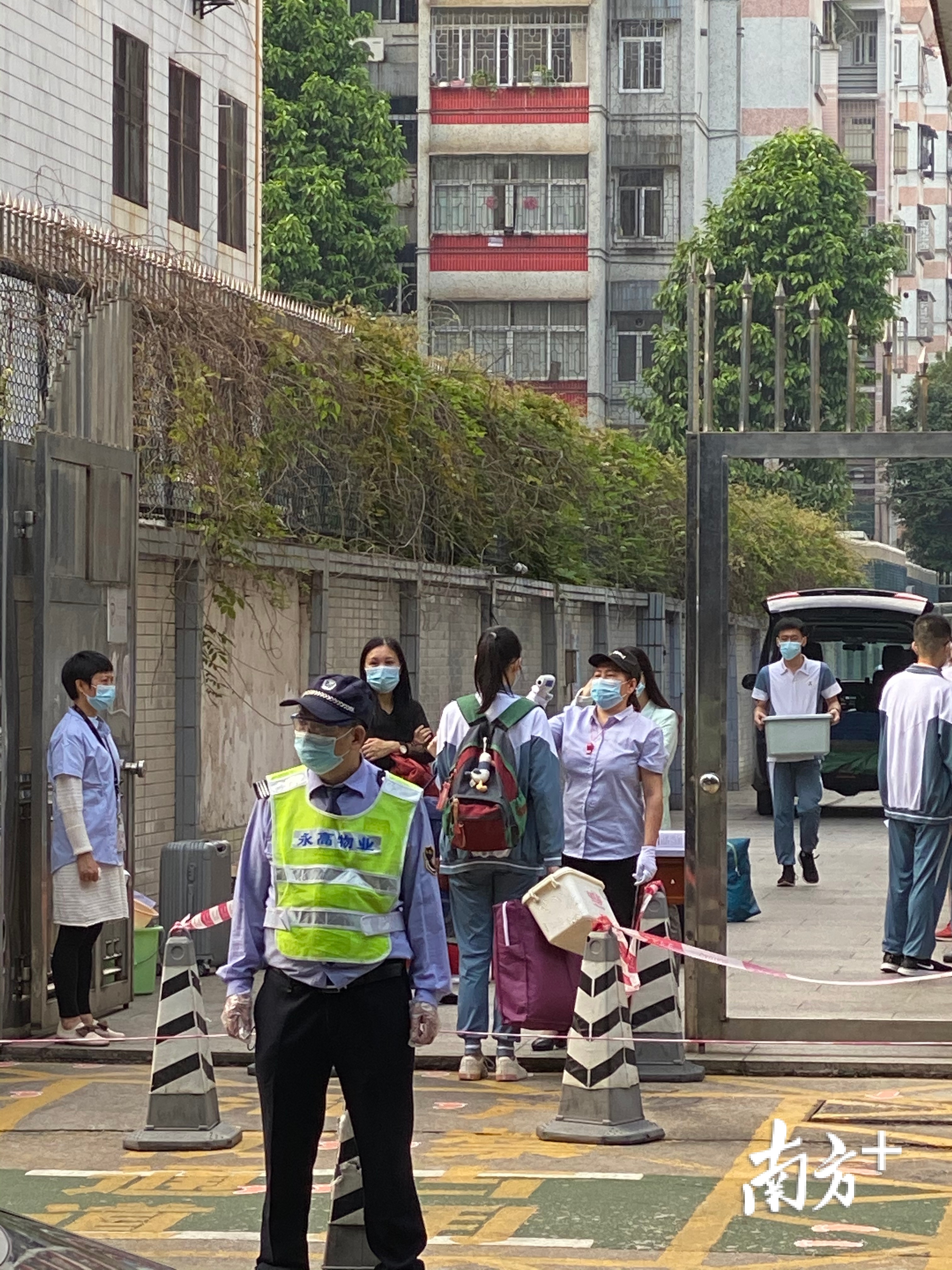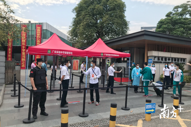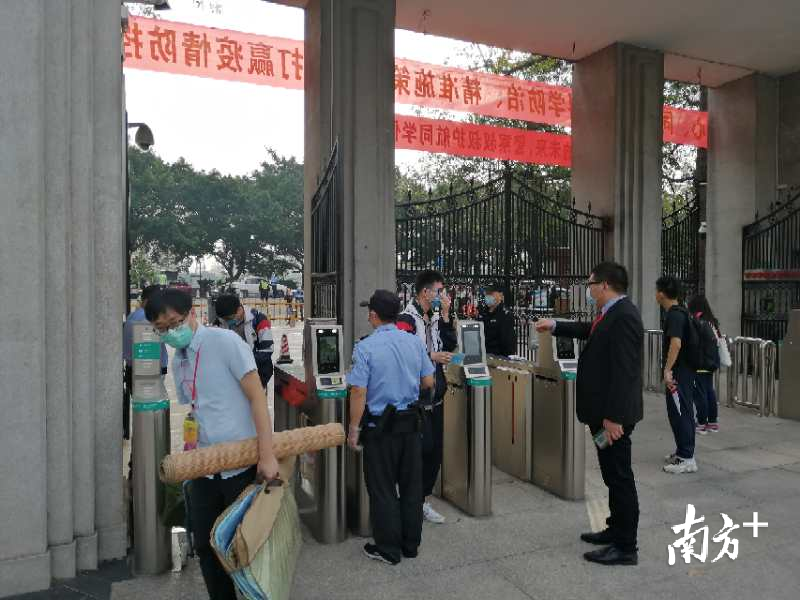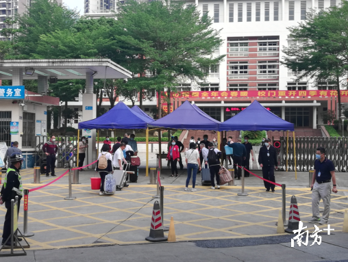 #南海#石门实验学校校门口,每隔几米设置疫情防控检测点,提醒家长需要测量体温和出示粤康码。学校教职工在校门口组成义工队协助学生搬运行李。