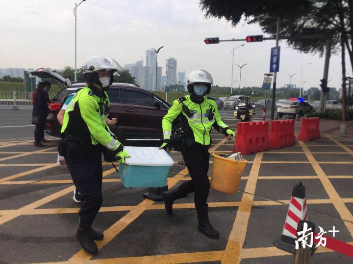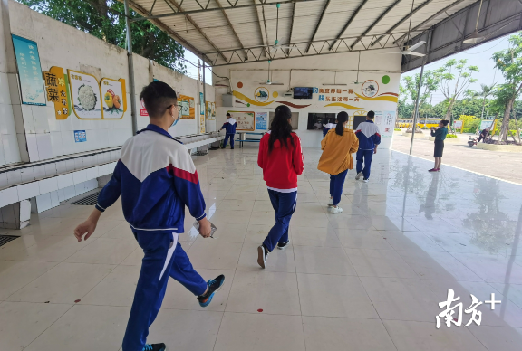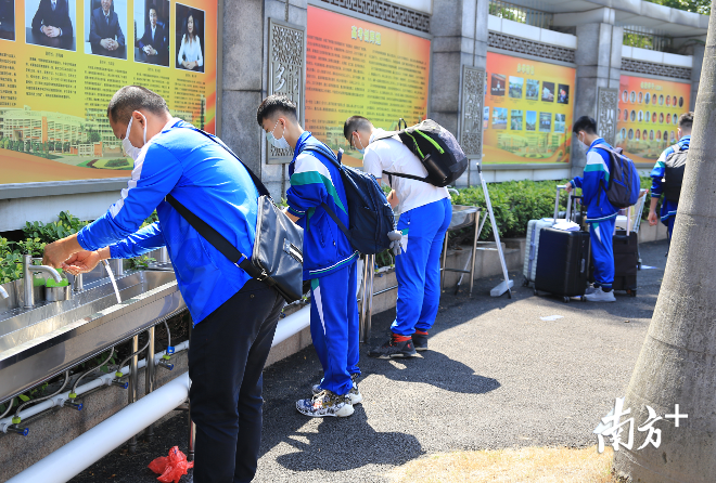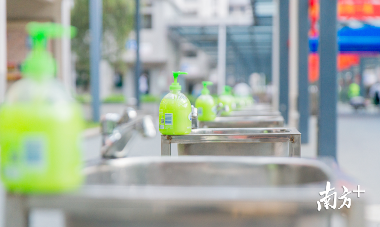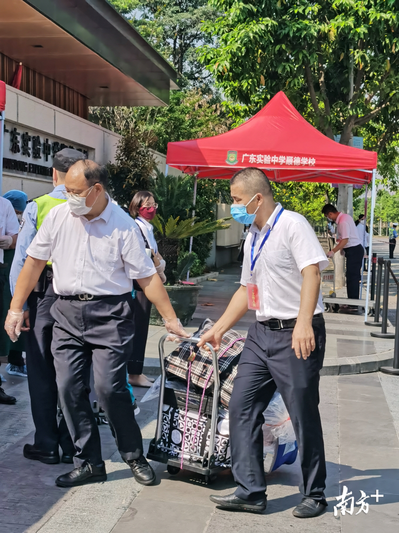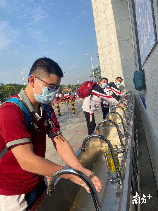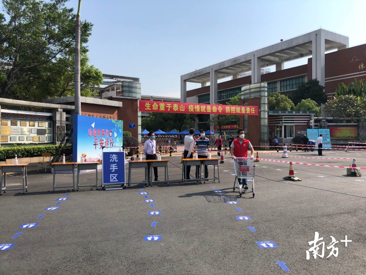 #南海#华附南海实验高中专门设置了洗手区,还有身着红马甲的自愿者推着手推车帮学生搬运物品。