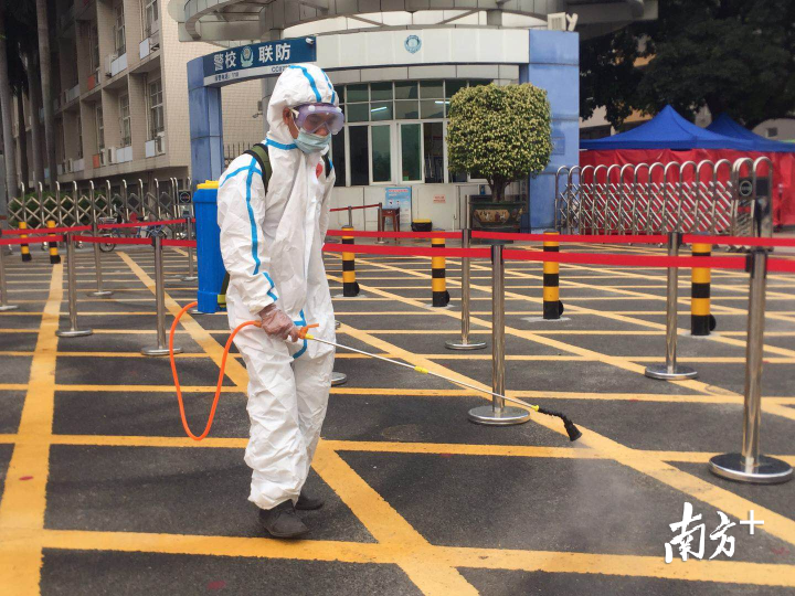 #复课防疫#在佛山市三中门口,有关人员穿着防护服,在排队等候区消毒。