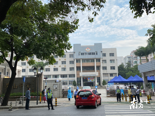 #禅城#荣山中学走读生从前面大门入,住宿的学生从后门入,有警察在前后门维持交通秩序,学生入校都有测体温。