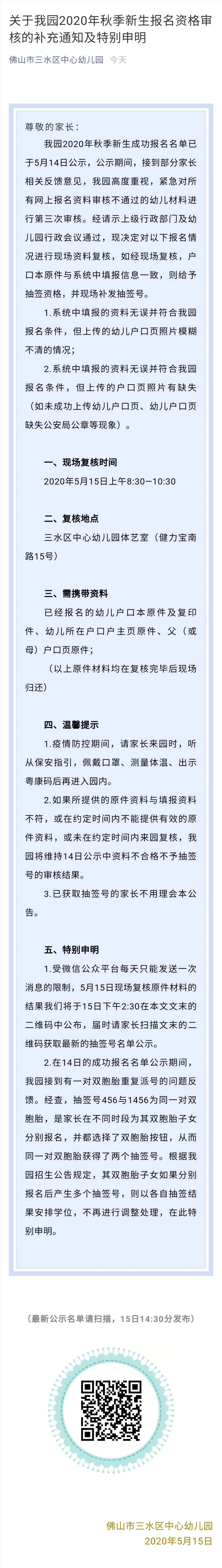 5月15日凌晨,佛山市三水区中心幼儿园发布关于该园2020年秋季新生报名资格审核的补充通知及特别申明。通知显示,该园2020年秋季新生成功报名名单已于5月14日公示,公示期间,接到部分家长相关反馈意见,紧急对所有网上报名资料审核不通过的幼儿材料进行第三次审核,现决定于5月15日上午8:30至10:30对部分报名情况进行现场资料复核。