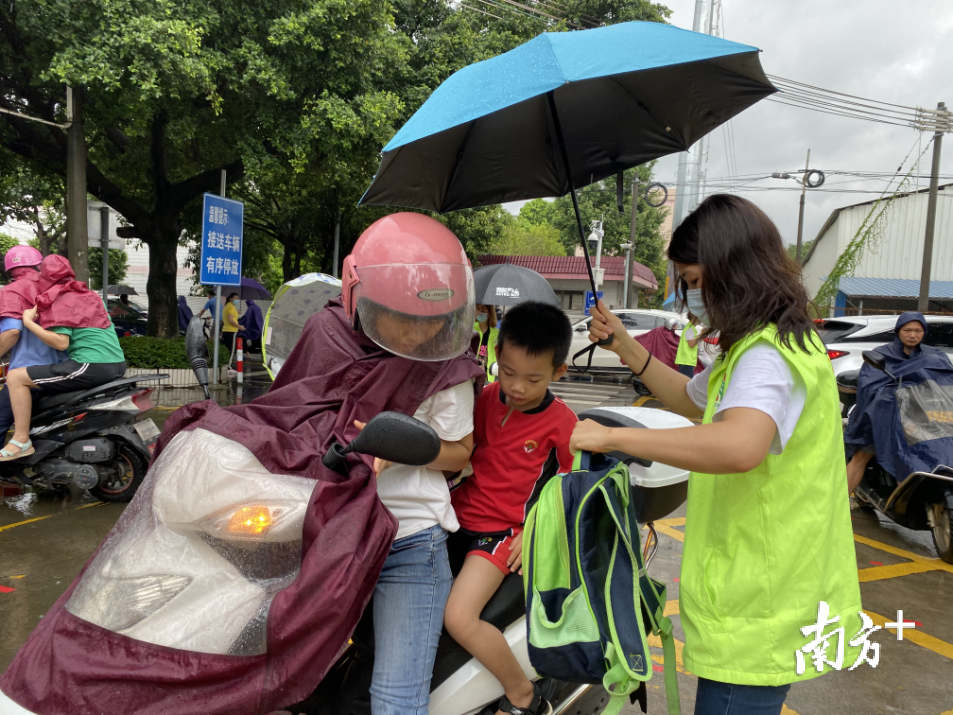 西樵七星幼儿园的家长义工一手撑着雨伞,一手抱孩子下车,把孩子安全地护送到幼儿园里。一件件绿马甲,在雨中尤为夺目。