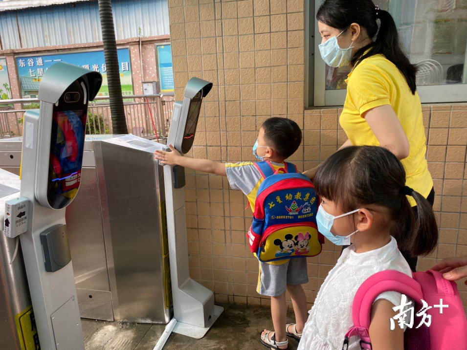 西樵七星幼儿园老师指导幼儿进行人脸识别及测温才进园。