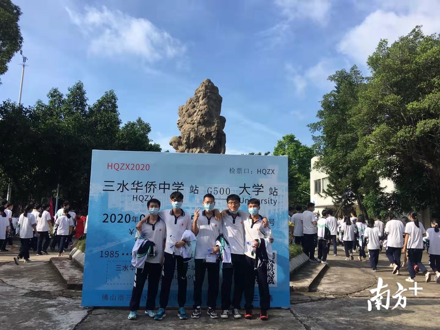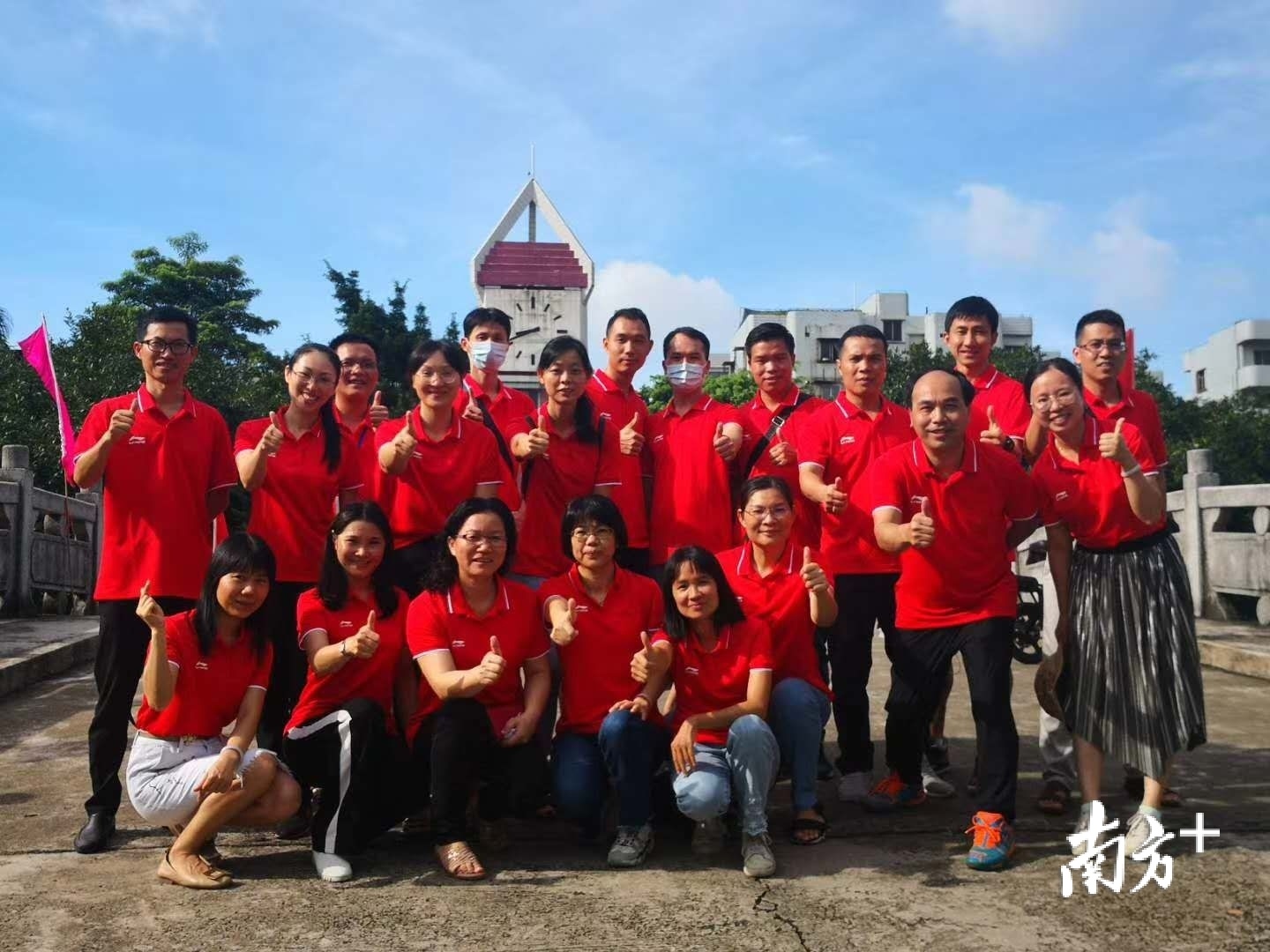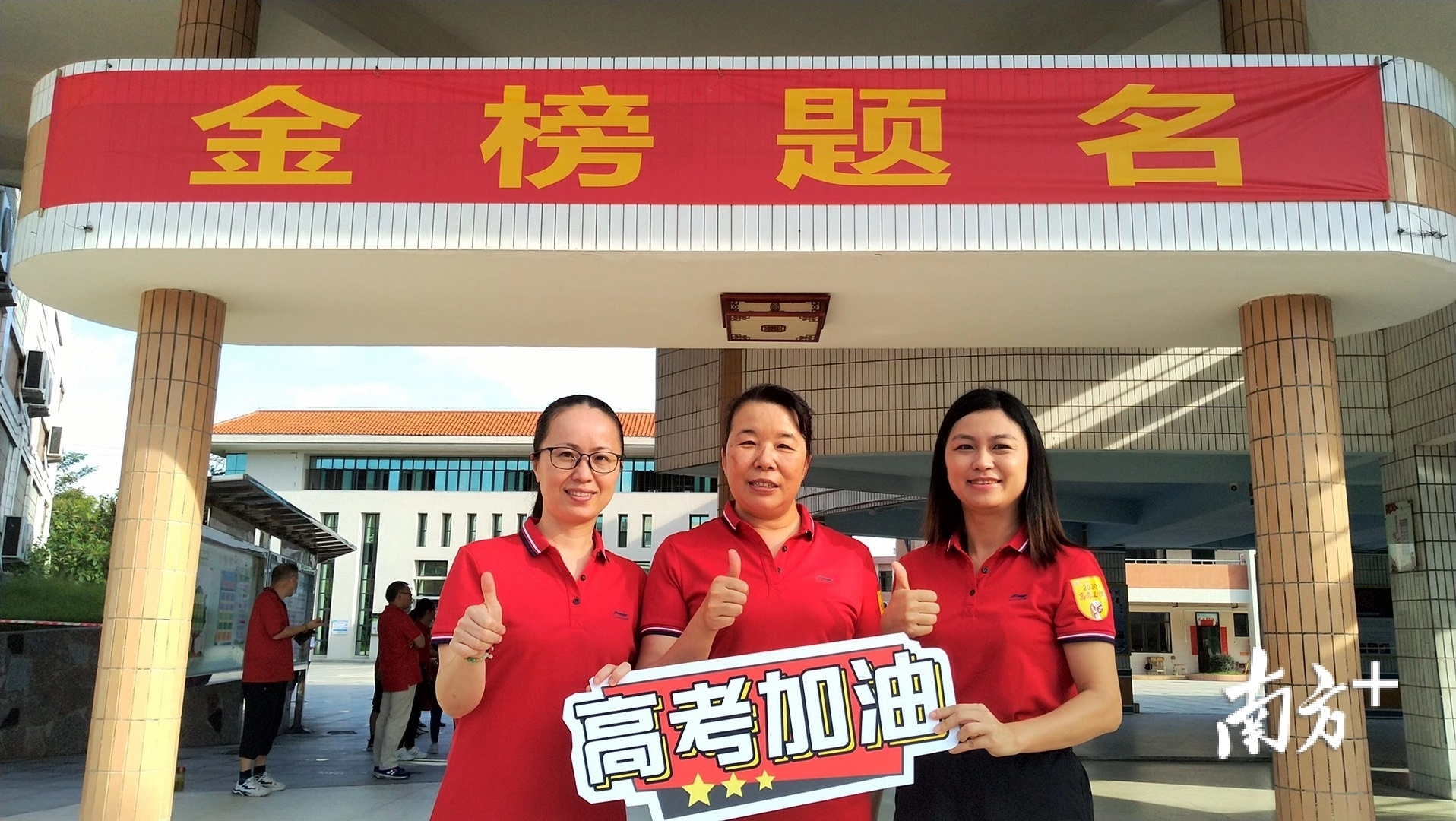 高考首日,三水华侨中学的老师们身着红色衣服,希望为考生带来好运。学校还特别设置了供学生拍照留念的区域,不少师生考前共同合影留念。