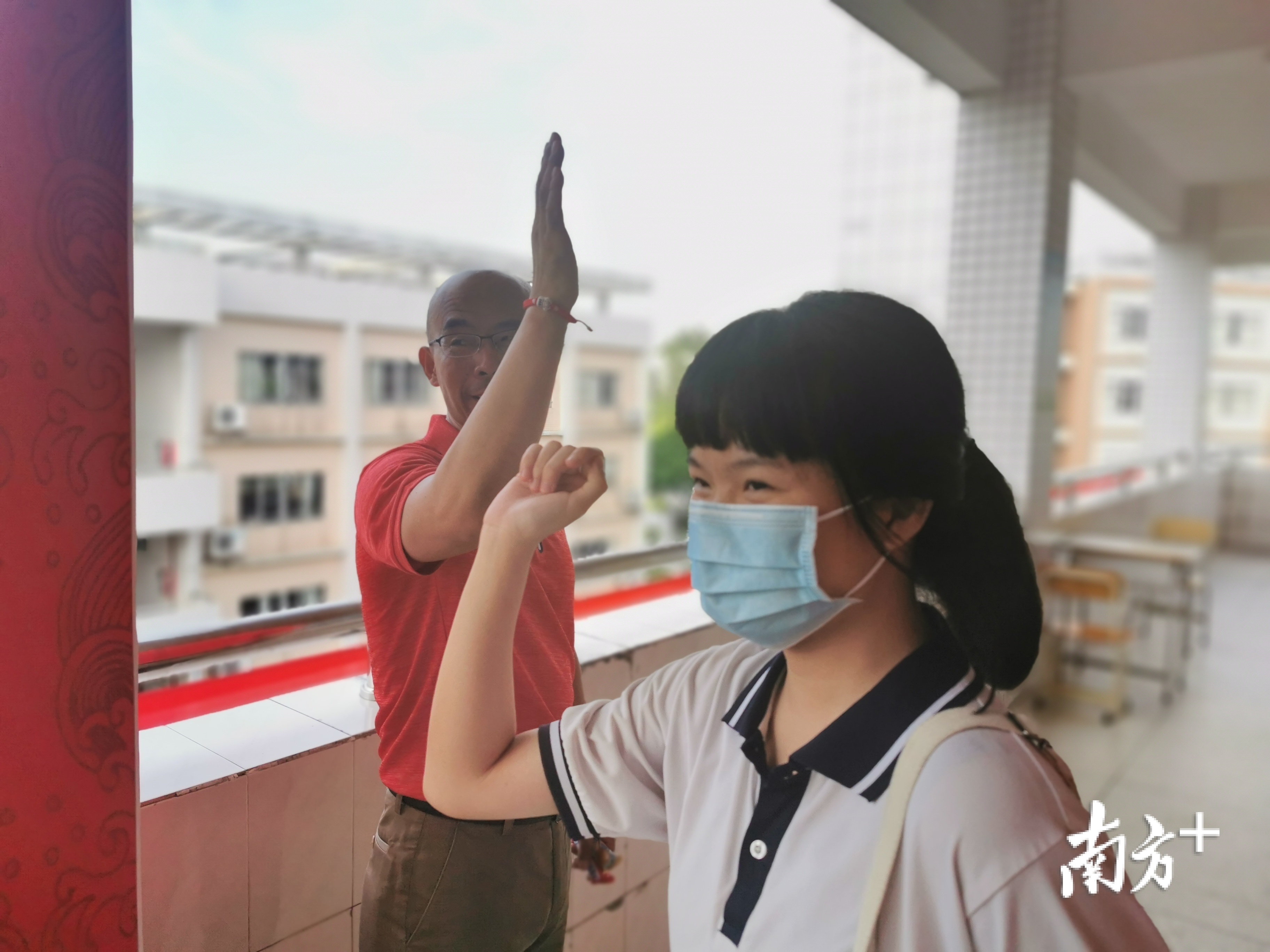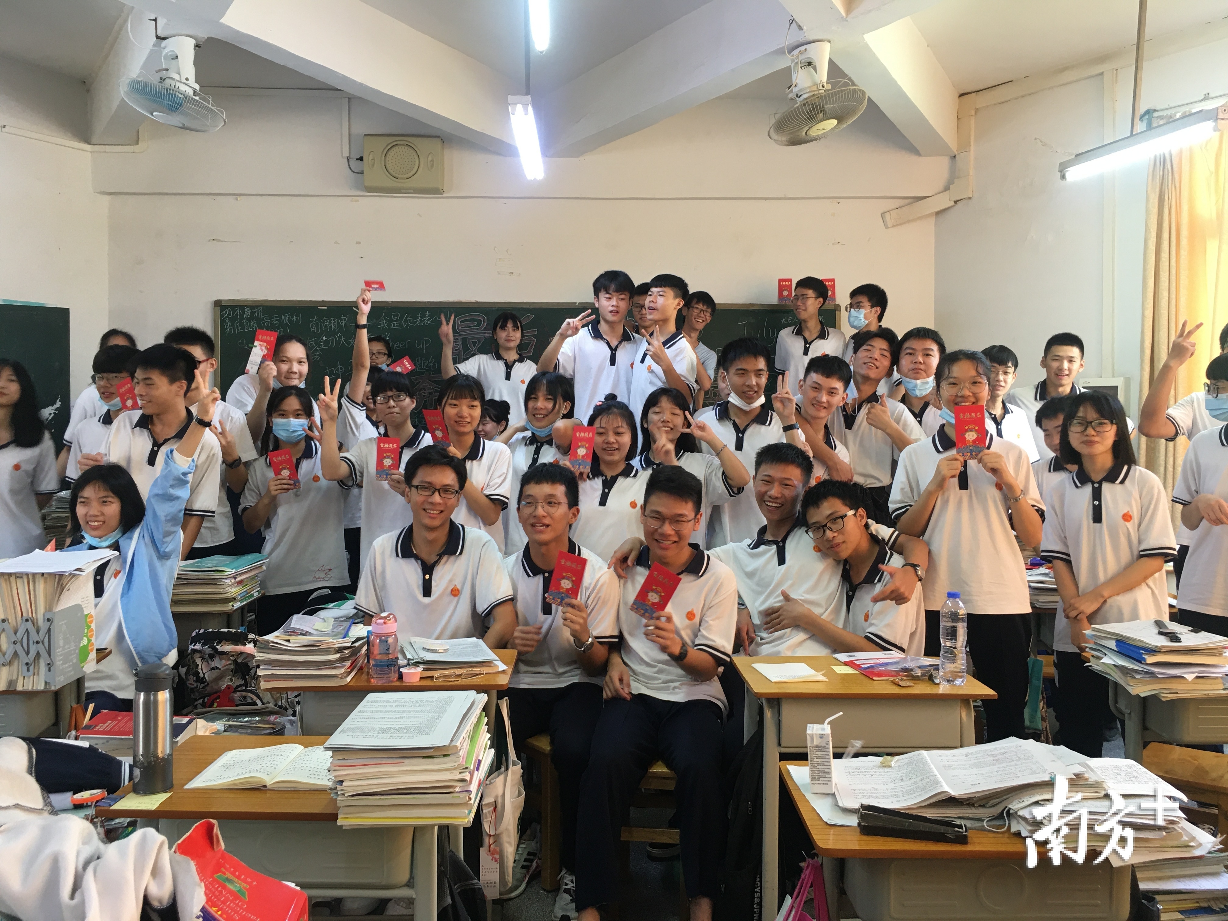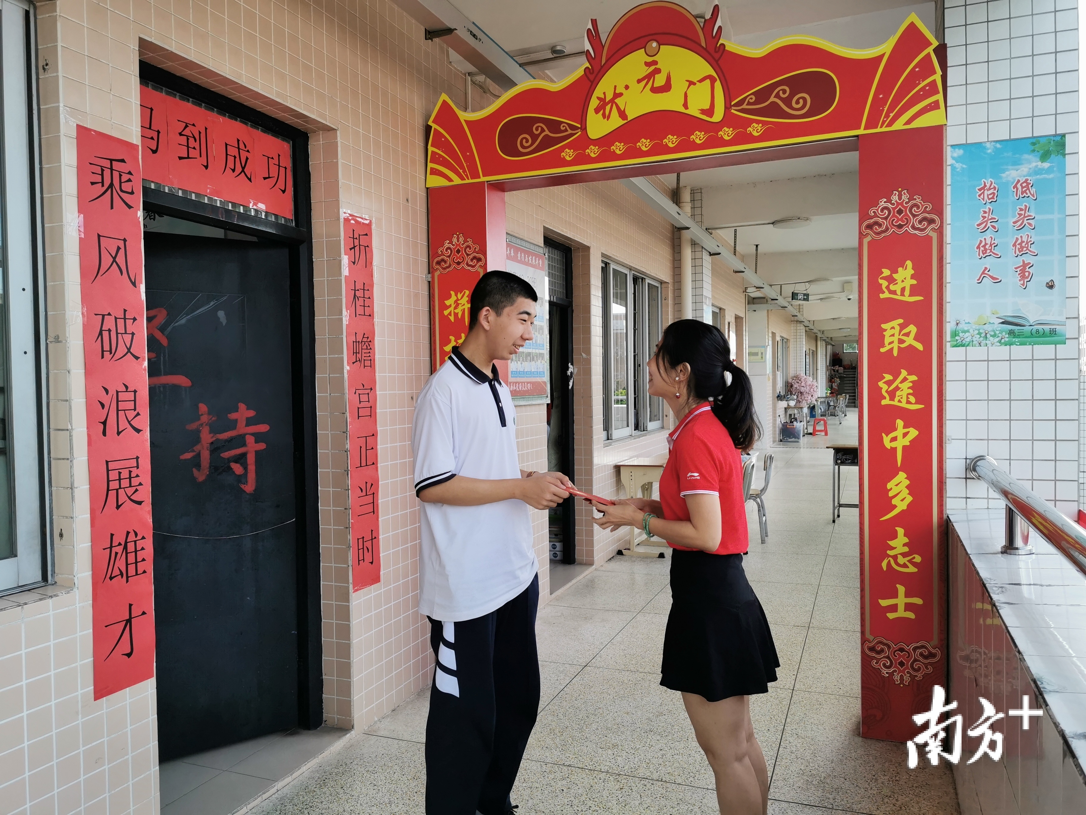 “2020,高考必胜!”“2020,三中必胜”……今晨,在三水中学考点内,此起彼伏的宣誓声响彻校园,该校教师身着红色衣服与考生击掌,班主任为考生送上红利是,为考生加油打气。