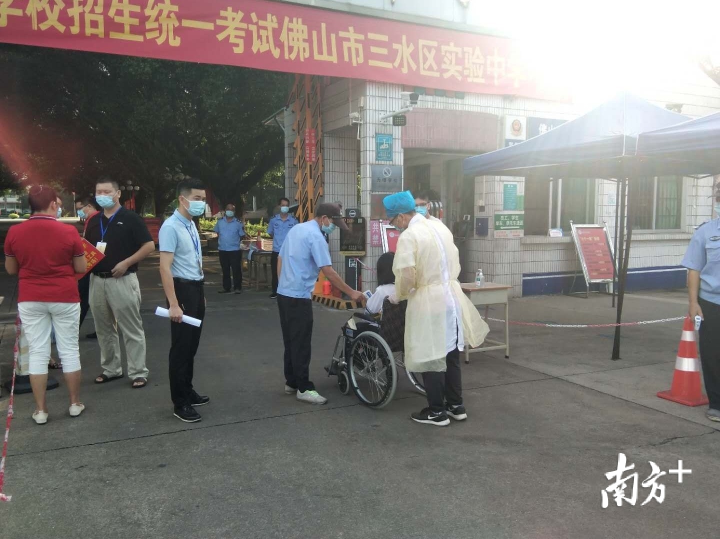 在三水区实验中学考点,该校老师精心呵护有伤病的考生进入考场。