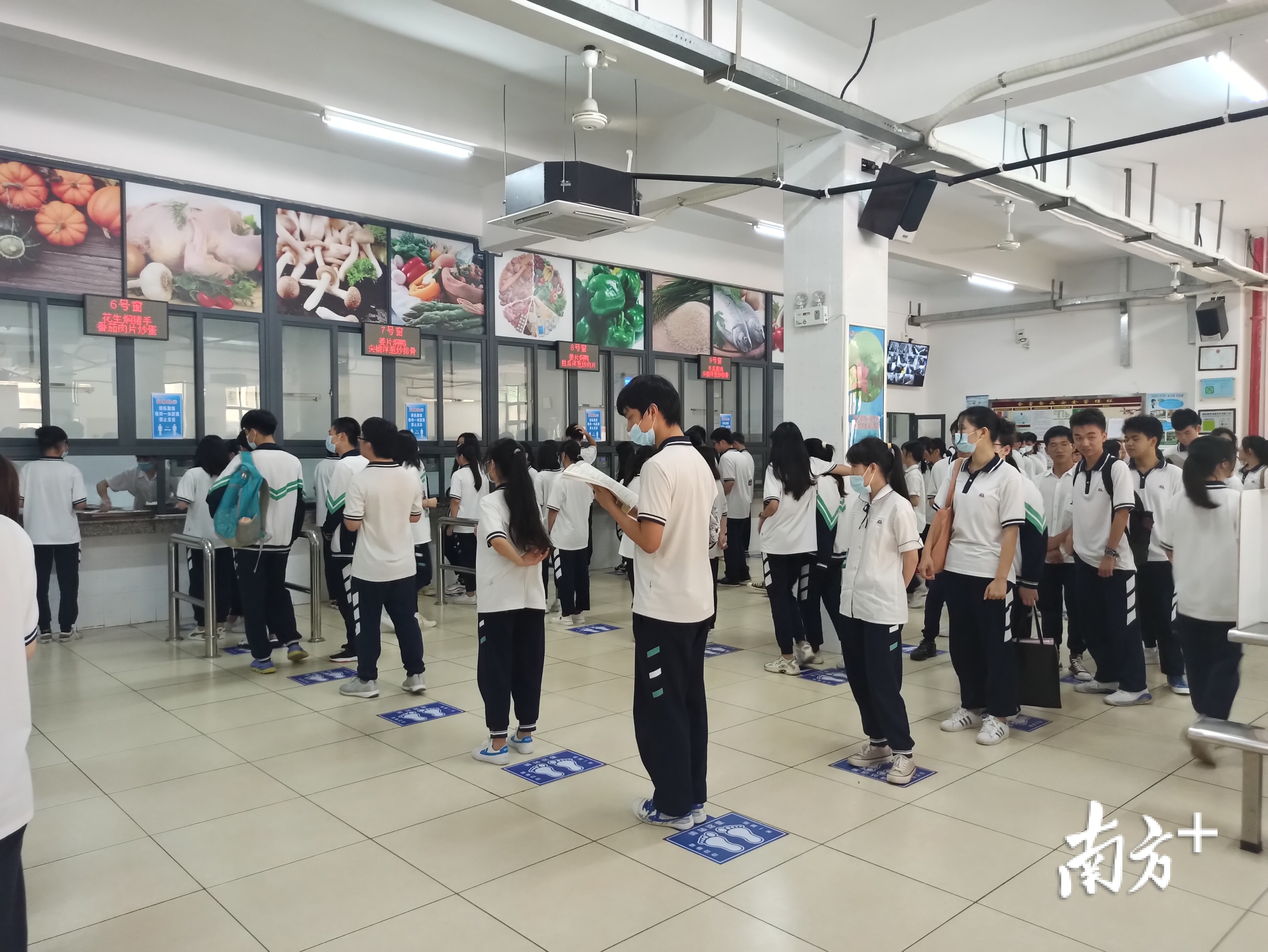 高考第一科语文学科结束后,三水区实验中学考点的考生前往学校饭堂就餐,不少学生在排队取餐的同时仍不忘抓紧时间,复习下一科知识点。