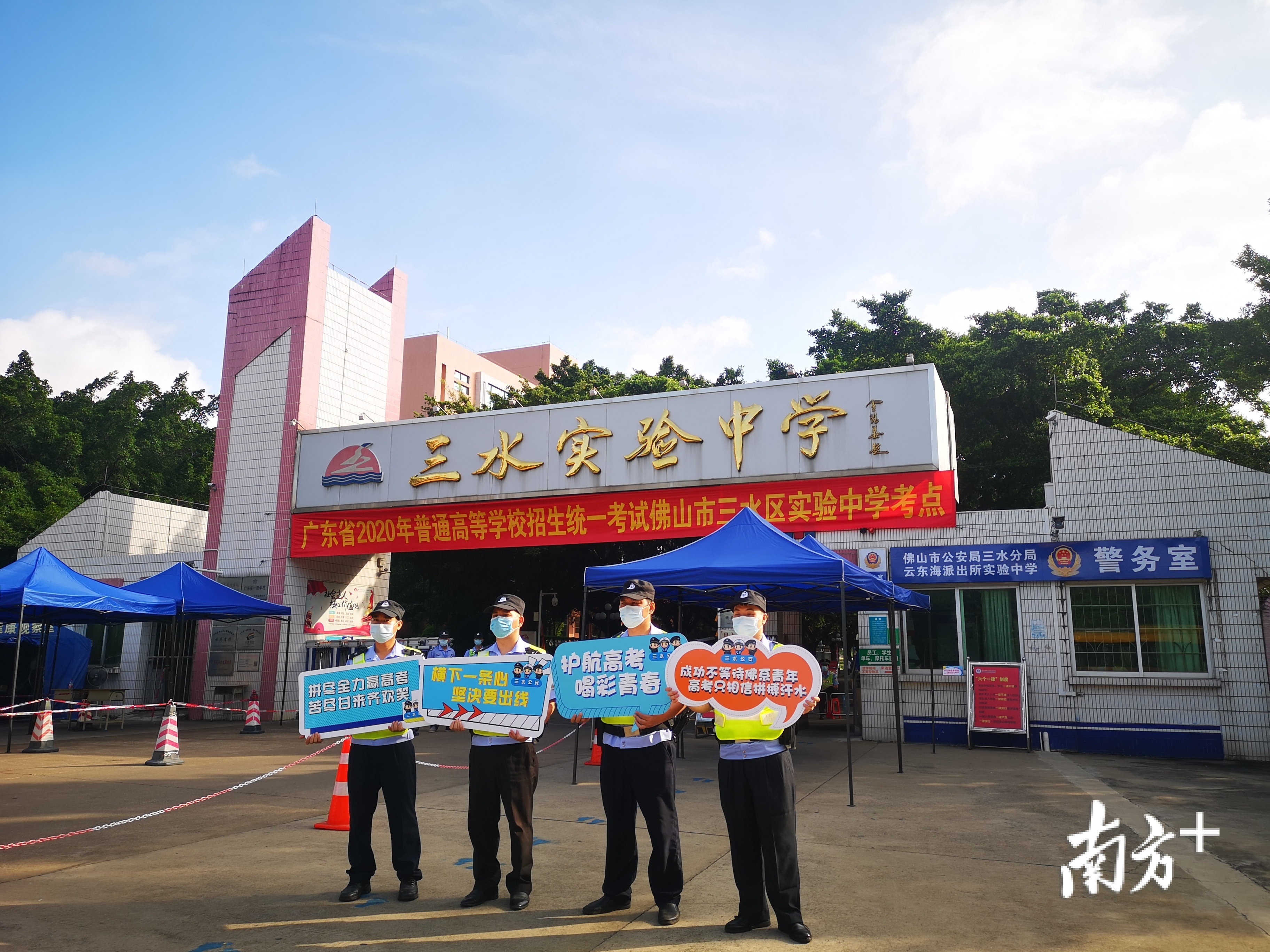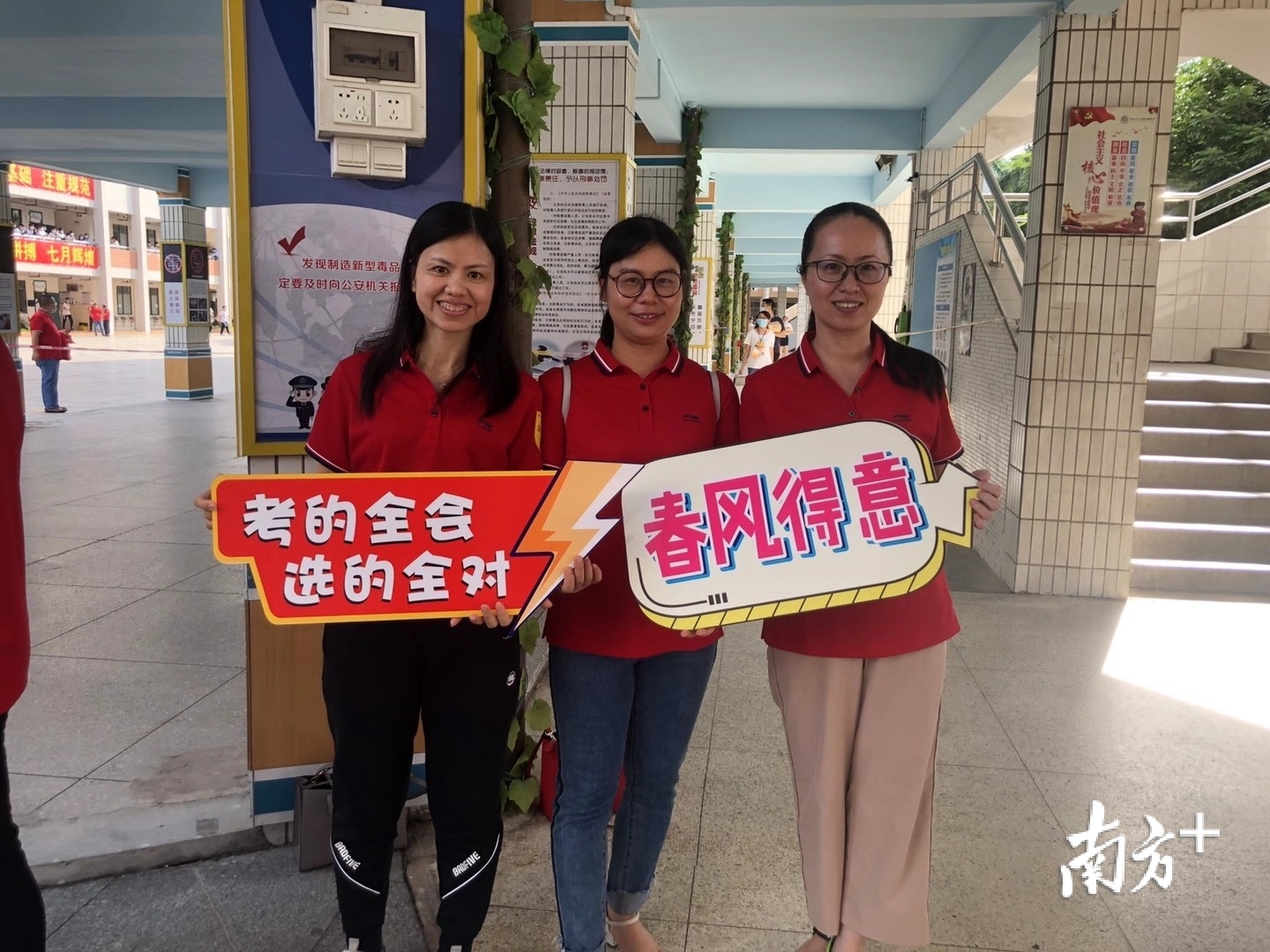 “旗开得胜”“考的全会,选的全对”……高考首日,三水区实验中学考点内,该校老师身着红色衣服,手持写有祝福语的手牌为考生应援加油助威。