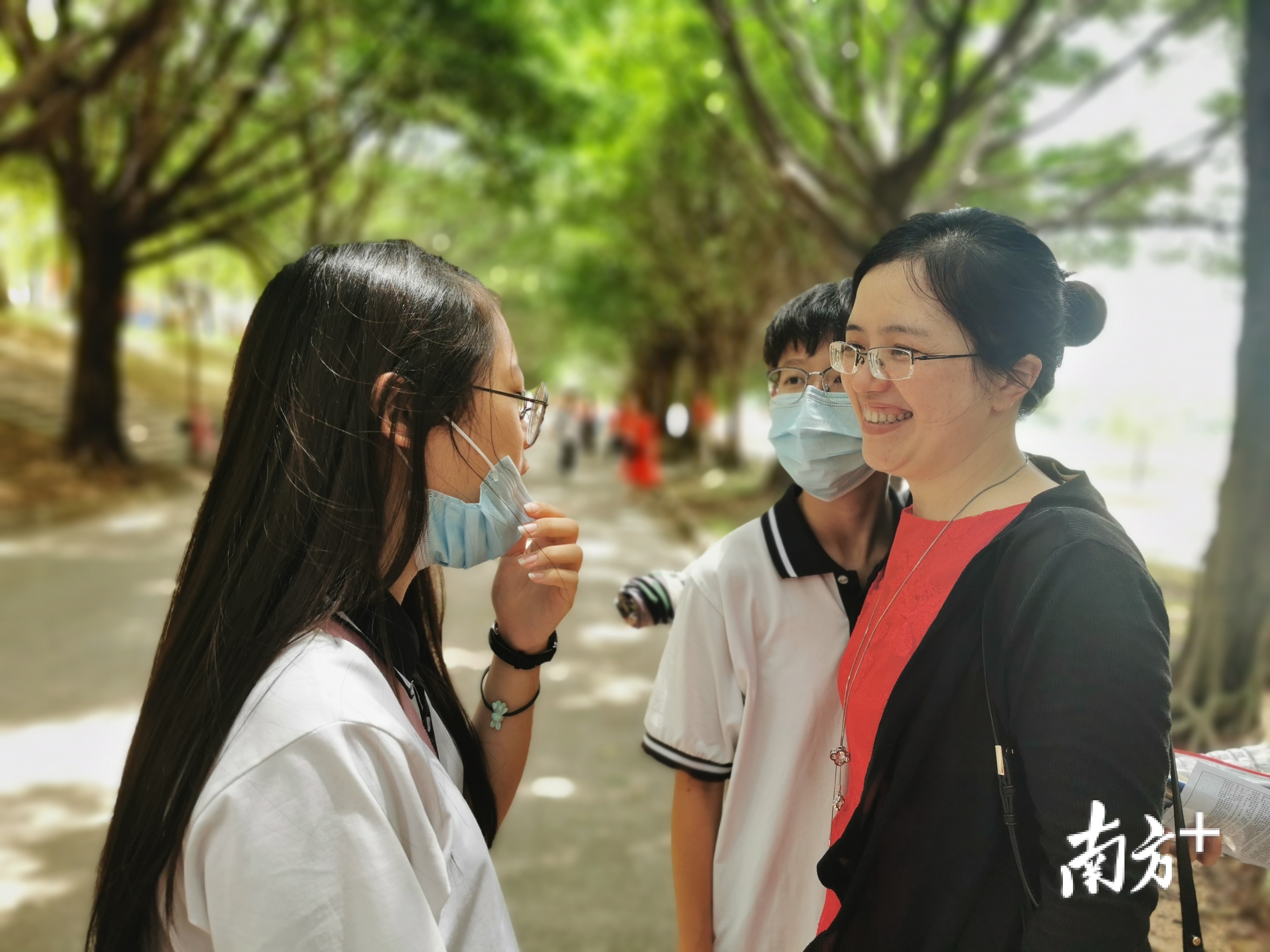 语文考试结束,三水中学考点分考生纷纷走出考场,该校老师仍在校道上欢迎学生,考生状态轻松地与老师交谈。