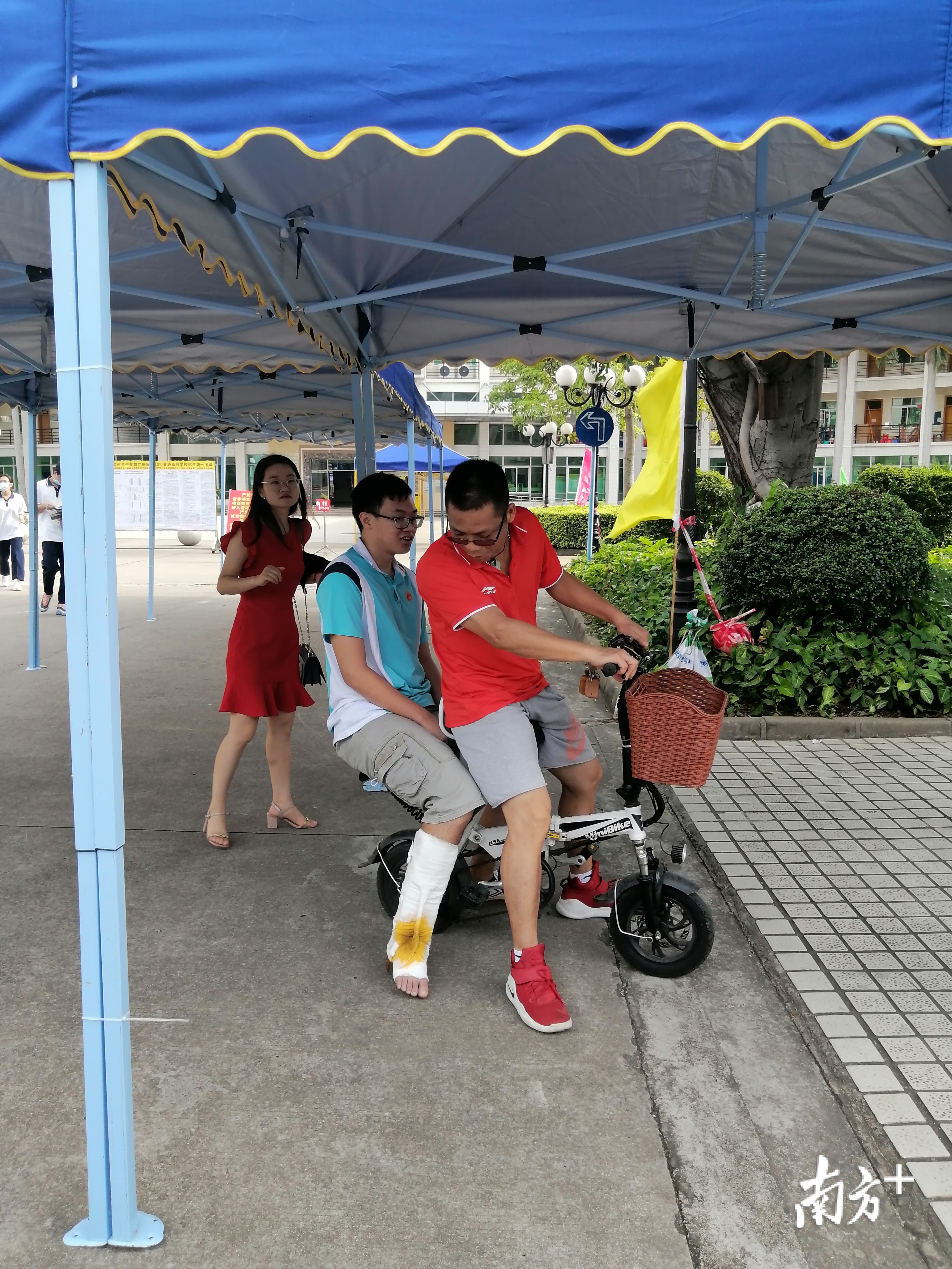 三水区华侨中学有一名考生因腿部受伤驻着拐杖前来考试,该校老师马上启动电动车接送考生进入校园,以免学生辛苦步行。