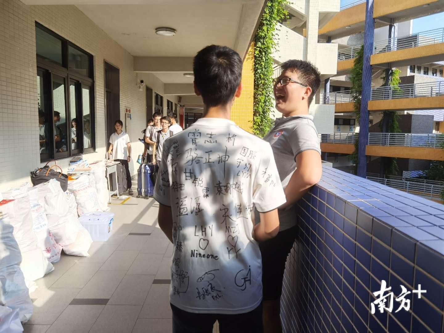 ▲考试结束后,顺德德胜学校的唐同学邀请全部男同学在他的校服上签名留念。