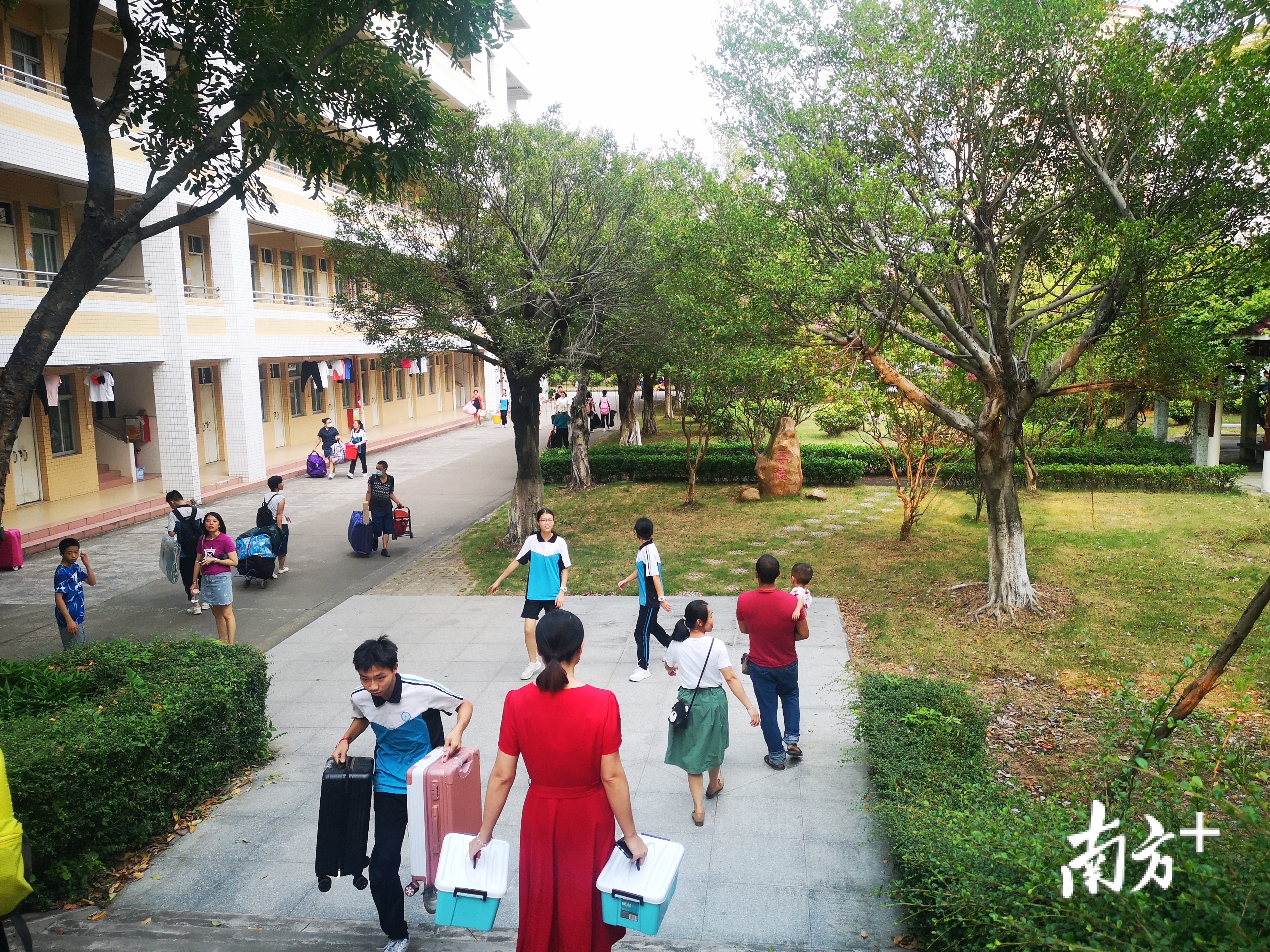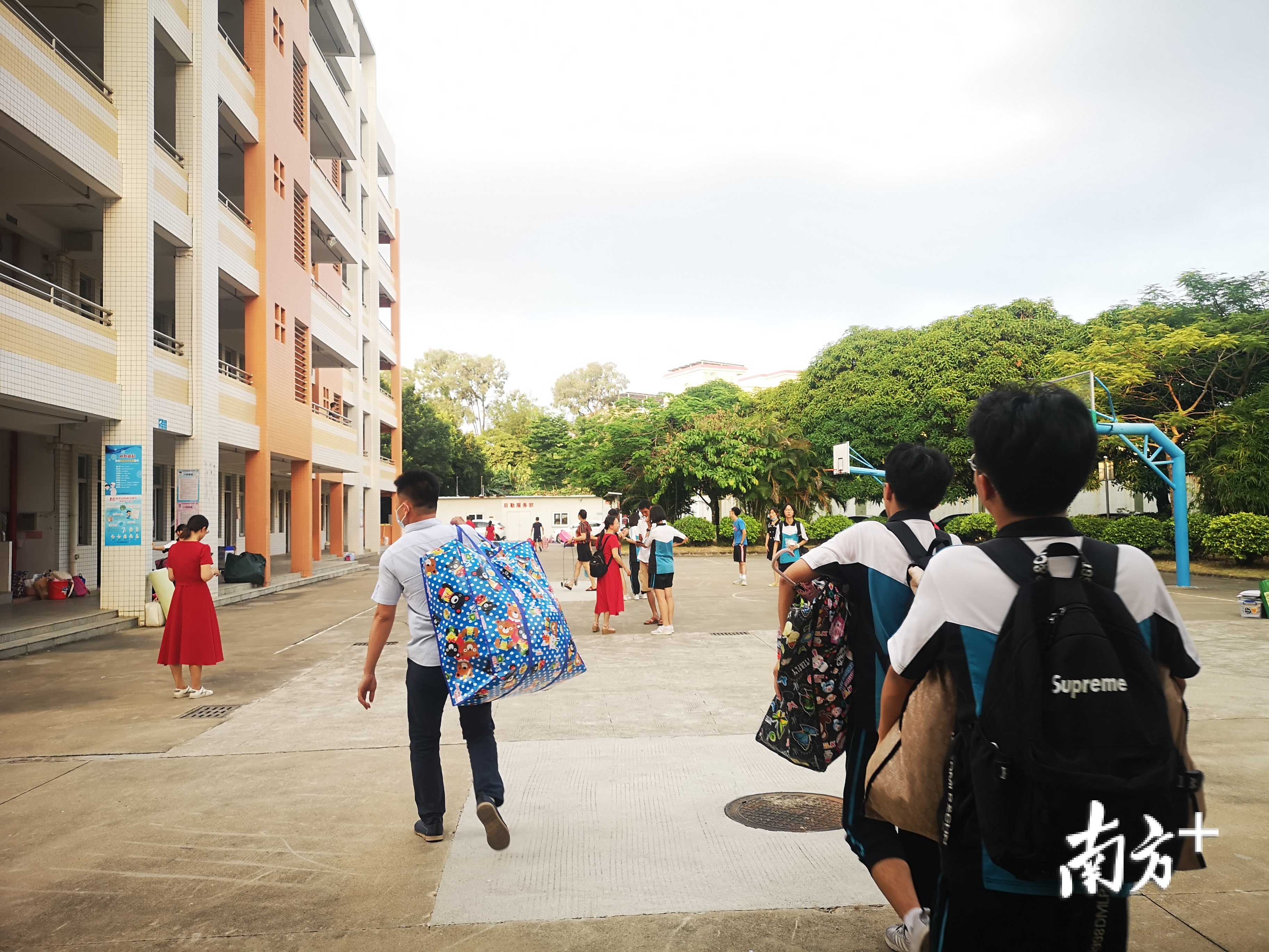 ▲在三水三中附中宿舍区,考生正和家长忙碌地打包行李。