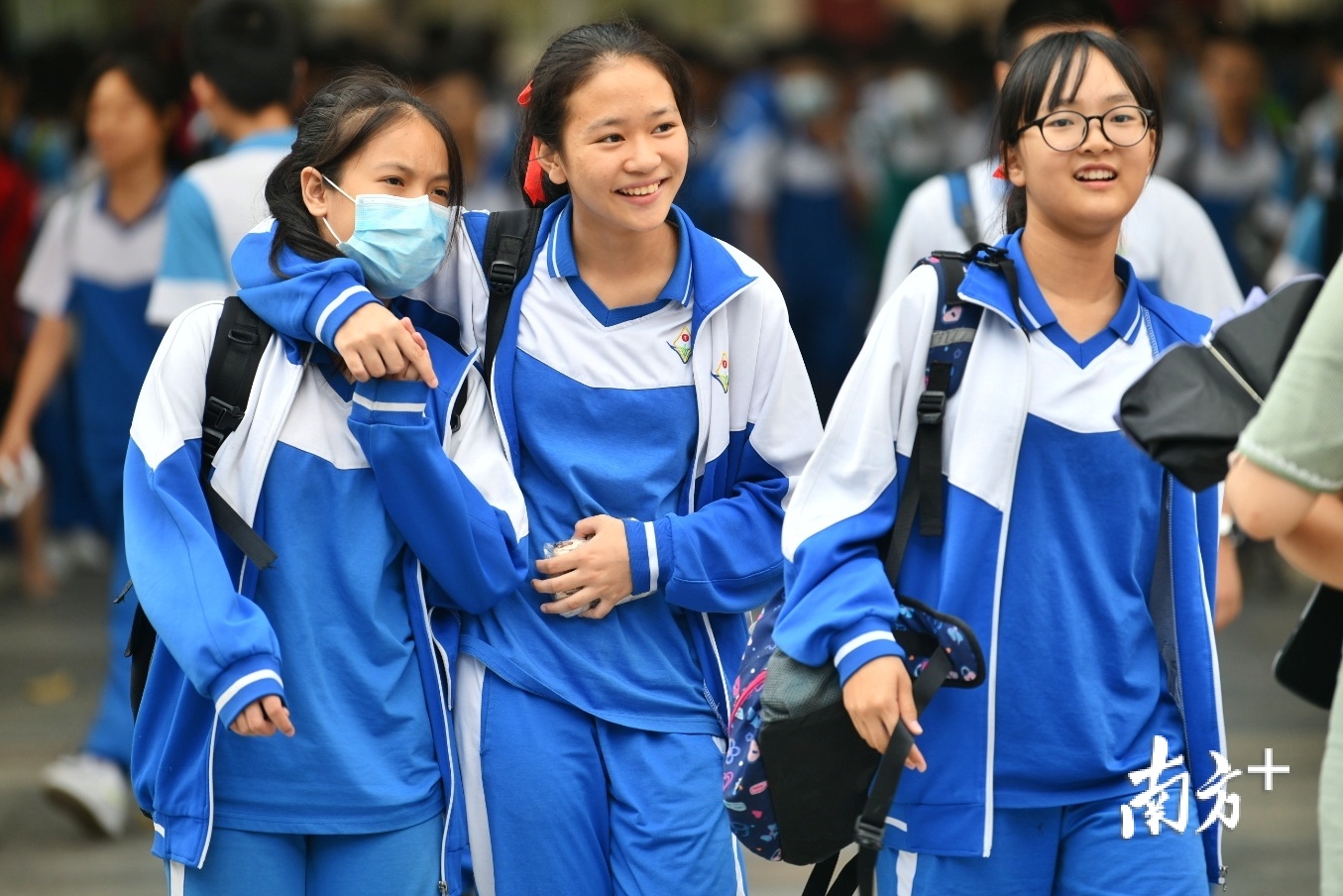 ▲佛山三中初中部考点,考试结束后,考生们显得十分放松,满脸笑容走出考场。