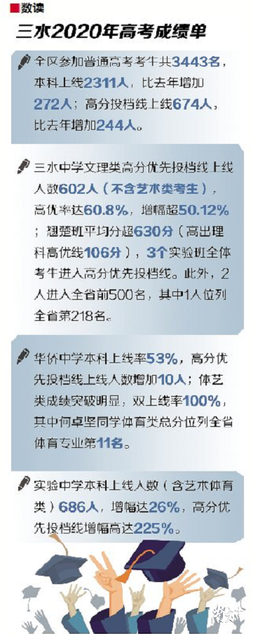 这只是今年三水高考捷报的一个缩影。据不完全统计,今年三水区参加普通高考考生共3443名,其中本科上线2311人,比去年增加272人,近七成学子可上本科;高分投档线上线674人,比去年增加244人。今年,三水区内三所公办高中高考成绩总体呈现良好上升态势,均创近年来高考成绩新高。