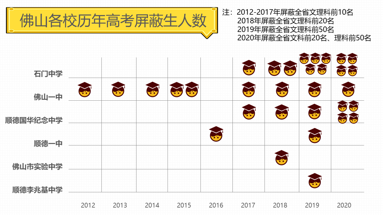 石门中学、佛山一中、顺德国华纪念中学以12名、9名、7名的成绩分列“佛山高考屏蔽生人数总榜”TOP3。佛山一中从广东高考首届屏蔽开始,仅2016年无屏蔽生,彰显老牌名校底蕴。