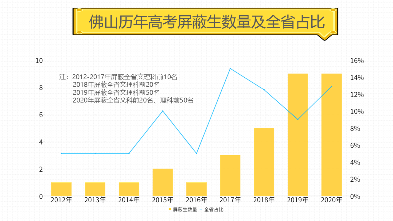 9年来,佛山屏蔽考生的数量一直呈攀升趋势,尽管有受益于2018—2020年,全省屏蔽考生从20名分别扩至40名、100名、70名,但从所占全省比例的角度来看,也总体上升。