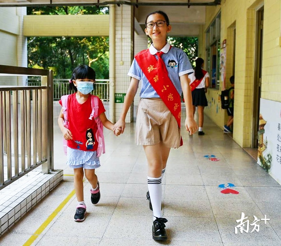 “不要担心,五年级的哥哥姐姐们来接你们了!”为了帮助新入学的一年级小朋友消除紧张感,玫瑰小学五年级学生专门迎新,与一年级小朋友手拉手,将他们送入教室。(戴嘉信 摄)