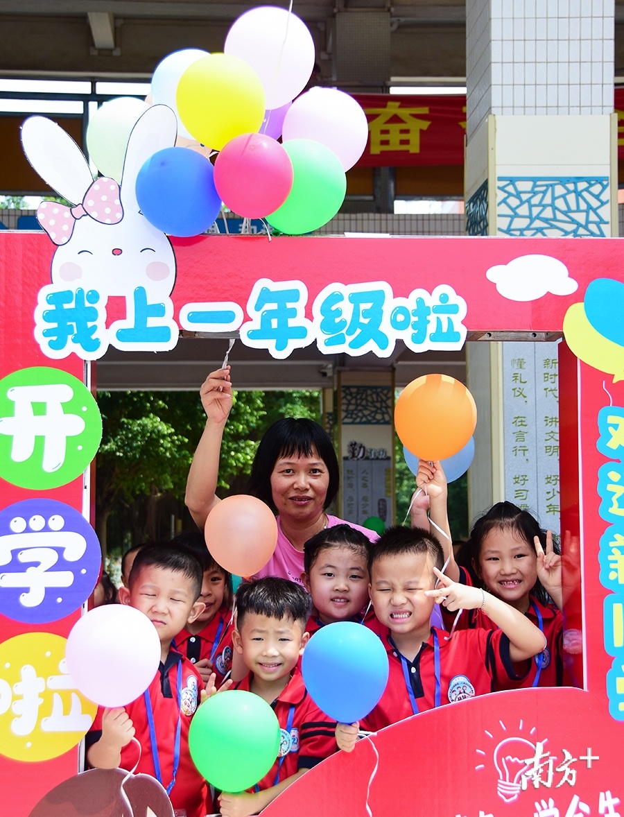 白坭镇第二小学的开学典礼暨新生入学仪式上,一年级小学生放飞梦想气球,阳光洒在大家的笑脸上。