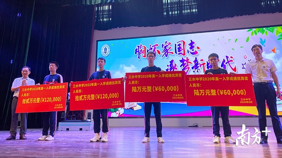 三水中学开学典礼上,2020年佛山市中考前100名、三水区高分考生林朗、李俊烨获得三水中学高一入学成绩优异奖12万元奖学金,谭幸章、钱智毅获得成绩优异奖6万元奖学金,共有141人获得约169万元的入学奖励。