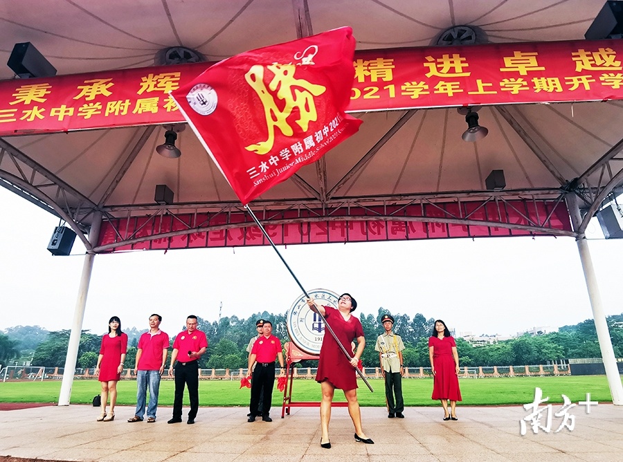 三水中学附属初中举行新旧初三战旗交接仪式。“全速前进,精进卓越!”是三中附中校长邵仲文送给三中附中学子的一句话,希望所有同学不断追求卓越!