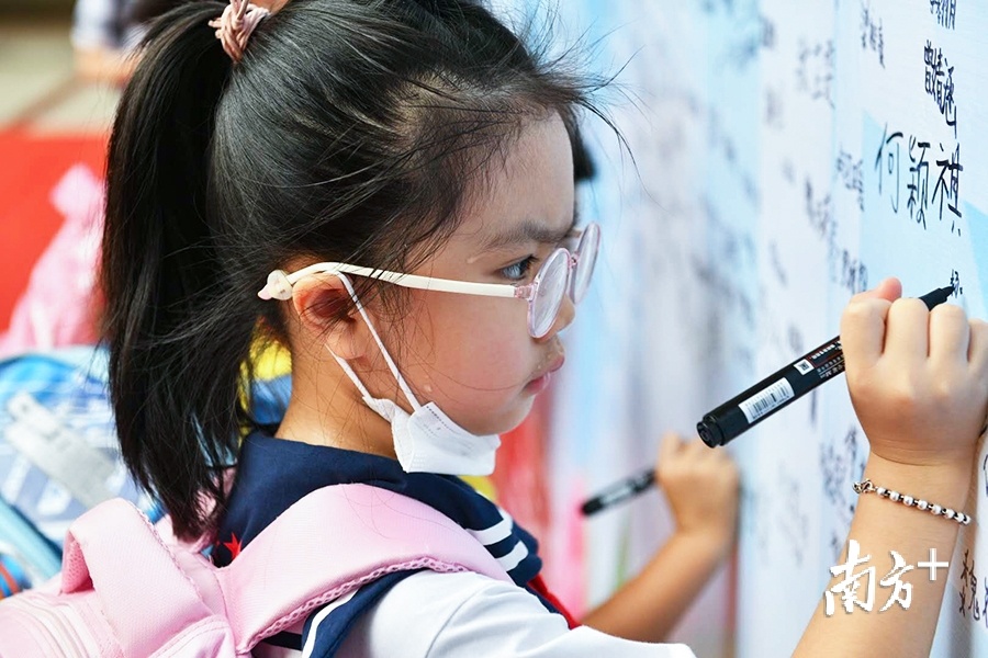 开学第一天晨曦,禅城区玫瑰小学同步举行“为文明城市助力”的创文签名活动,一位学生正一笔一划签下名字,汗水跌落额间也没顾得上擦拭。(戴嘉信 摄)