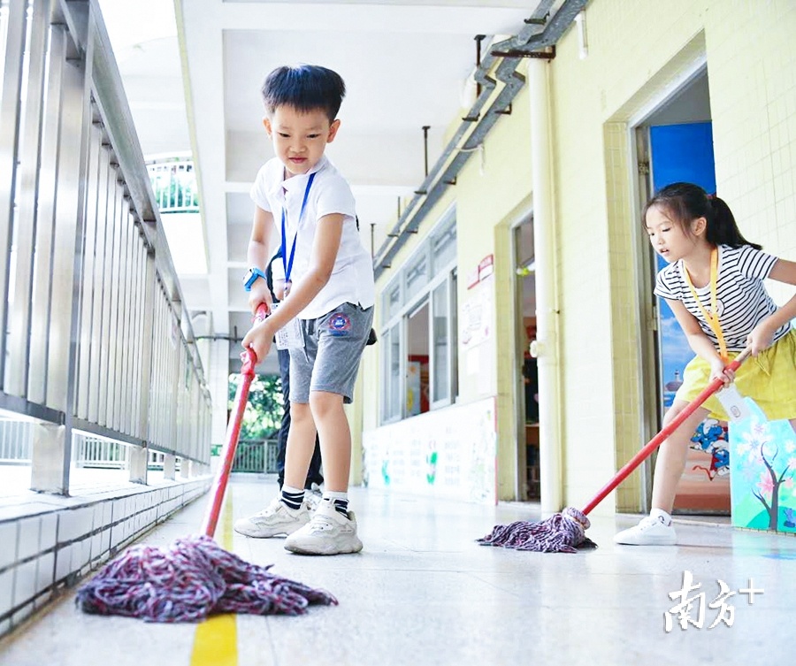 也许是很期待新学期了,玫瑰小学学生精神抖擞地打扫走廊。(戴嘉信 摄)