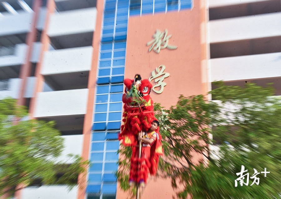 高明荷城中学的醒狮社团现场表演高桩采青,并揭开“学在荷中,爱在荷中,自信在荷中,成功在荷中”的条幅。