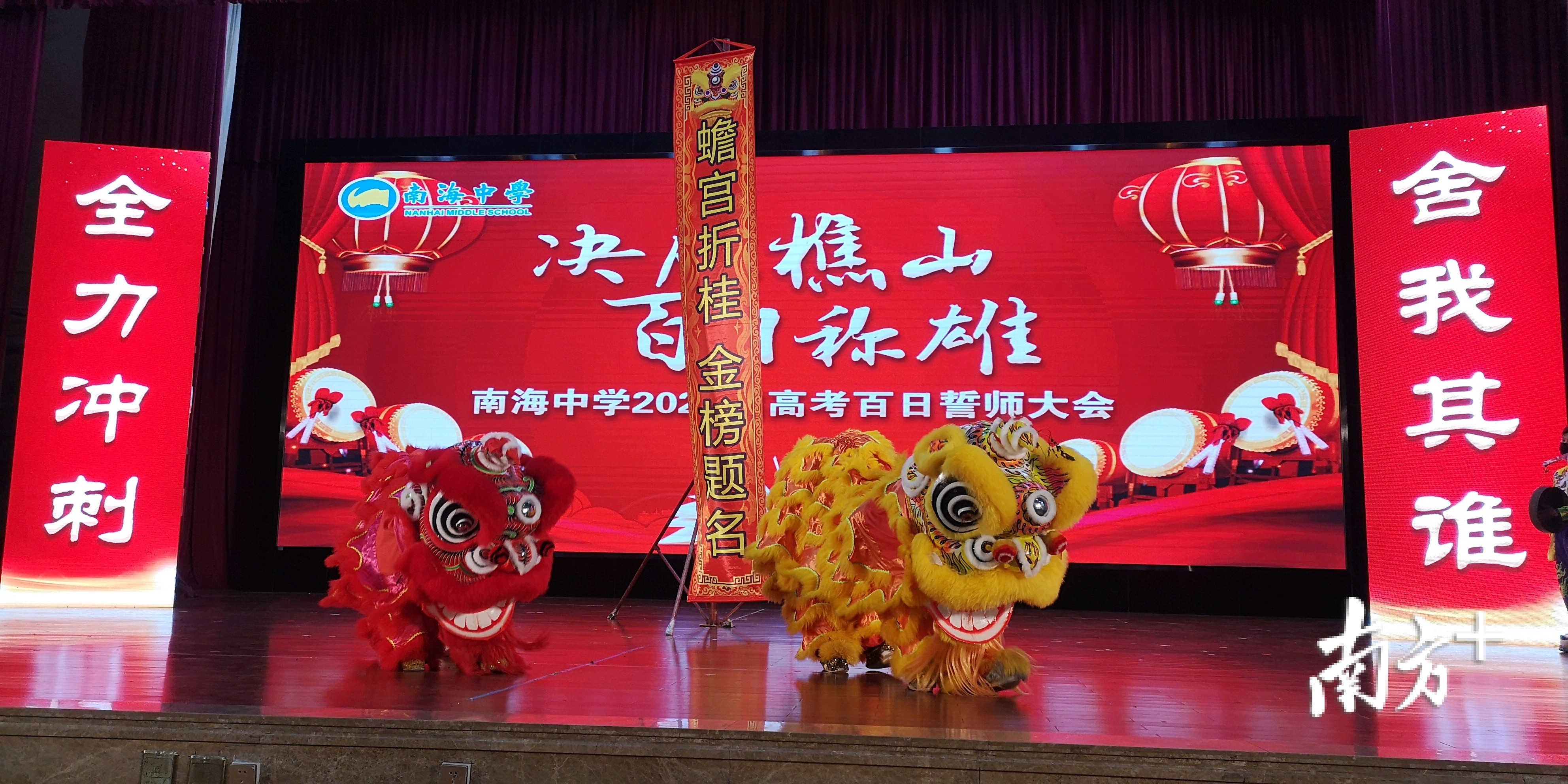 誓师大会现场,战鼓擂动,两头南狮精神抖擞希冀同学“蟾宫折桂,金榜题名”;家长代表视频送上祝福,勉励孩子“铸我实力,亮我风采”;各班同学高喊冲刺誓言,“争创南中新辉煌”。