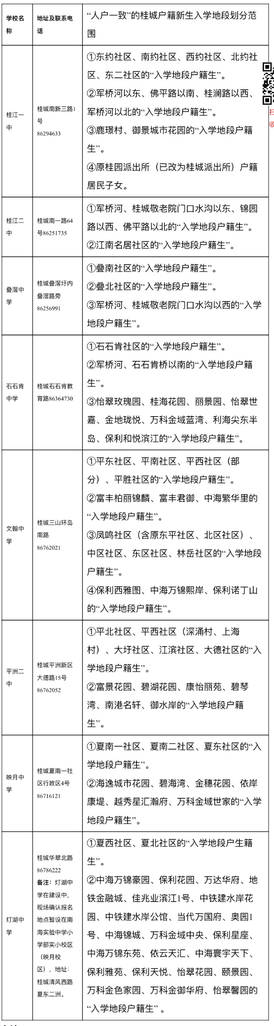 注:上表所指的“入学地段户籍生”是有时限性的,是指2021年4月8日前(含4月8日当天)入户在册的地段户籍生。之后迁入的该地段户籍生由桂城街道教育行政部门根据学位情况统筹安排到公办学校入读。