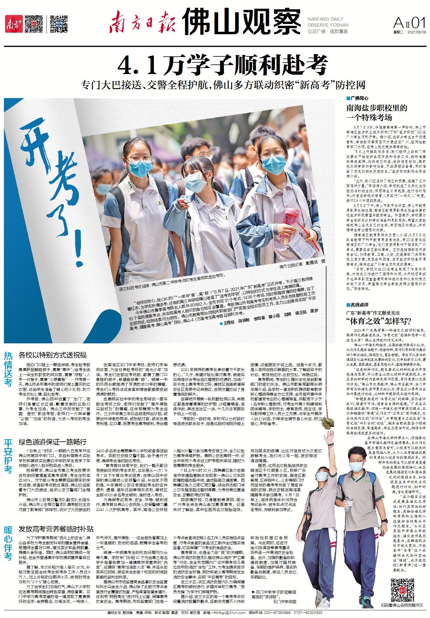 今年佛山市夏季高考报名人数共40882人,全市共设31个考点、1438个考场,同时根据疫情防控需要,设了10个备用隔离考点,并实现高考人脸识别身份验证全覆盖。考前佛山所有高考考生和考务人员全员核酸检测工作全部完成,检测结果均为阴性。佛山市教育局协同相关职能部门严密周全组织各项工作,全力以赴确保实现“平安高考、健康高考、暖心高考”目标,佛山4.1万高考生高考首日顺利开考。