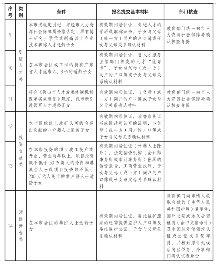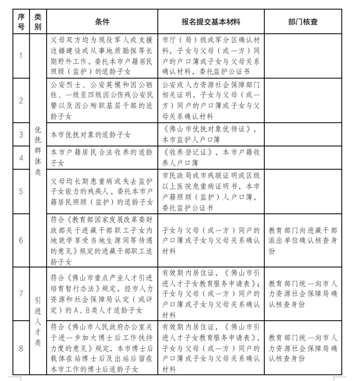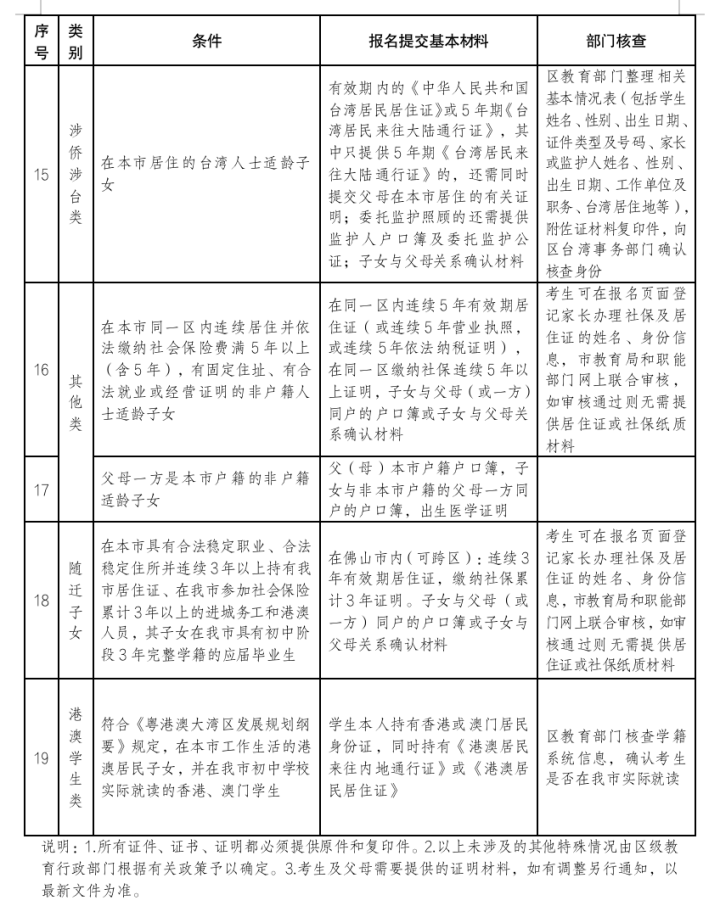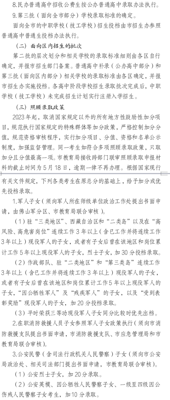 为贯彻国家和省相关精神,佛山市2023年起取消国家规定以外的所有地方性鼓励性加分项目,保留现役军人、在职消防救援人员和因公牺牲警察相关优待项目(以上各类含烈士、伤残),维护教育公平。根据中共中央、国务院《粤港澳大湾区发展规划纲要》精神,在本市工作生活的港澳居民子女,并在佛山市初中学校实际就读的香港、澳门学生,给予本市户籍考生同等报考资格。